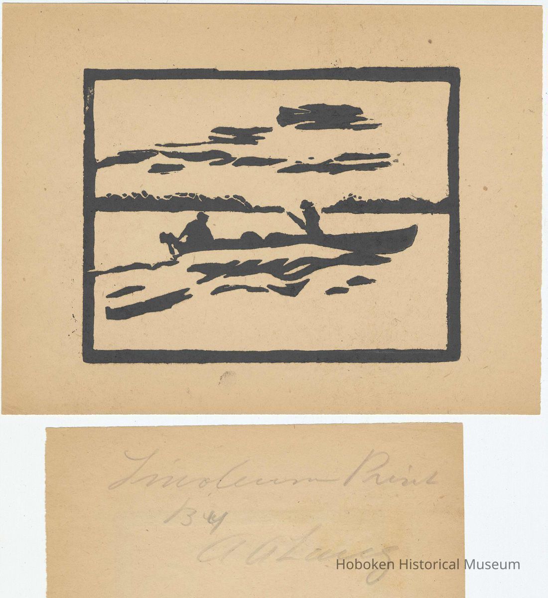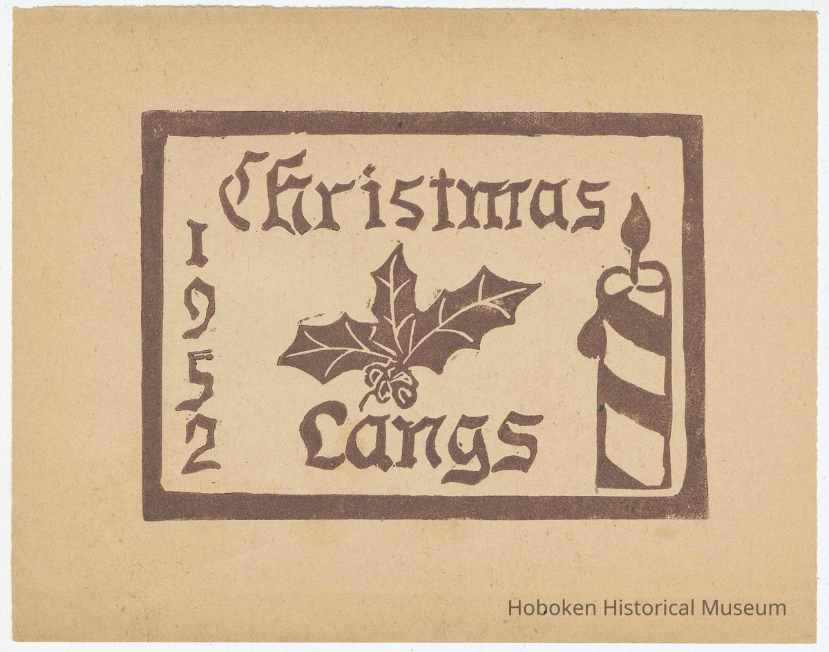 Two enclosures laid-in: linoleum prints by A. A. Lang, 6-1/8" high x 7-7/8" wide. Both have pencil notation on the reverse identifiying them as "Linoleum Print by A.A. Lang." Enclosure 1 is a 1952 Christmas print; 2 is a small boat on water with two people.