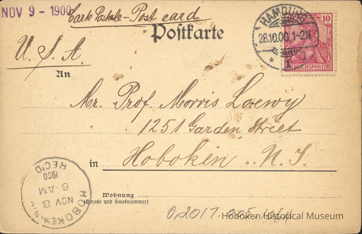 back Postale - Post card Portkarte U. S. A. An Her. Prof. Morris Loewy 1251 Garden Street in Hoboken N.J. Wohnung (Straße und Hausnummer)