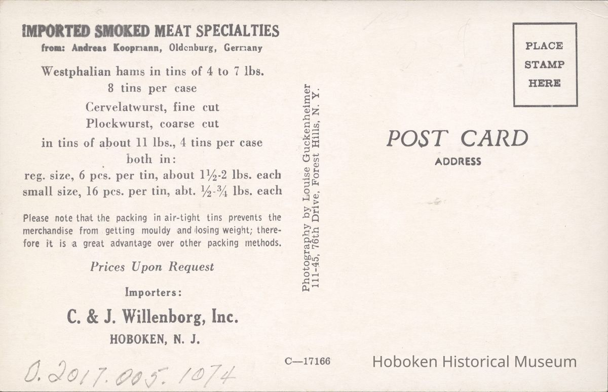 Color Postcard: C. & J. Willenburg, Hoboken, NJ