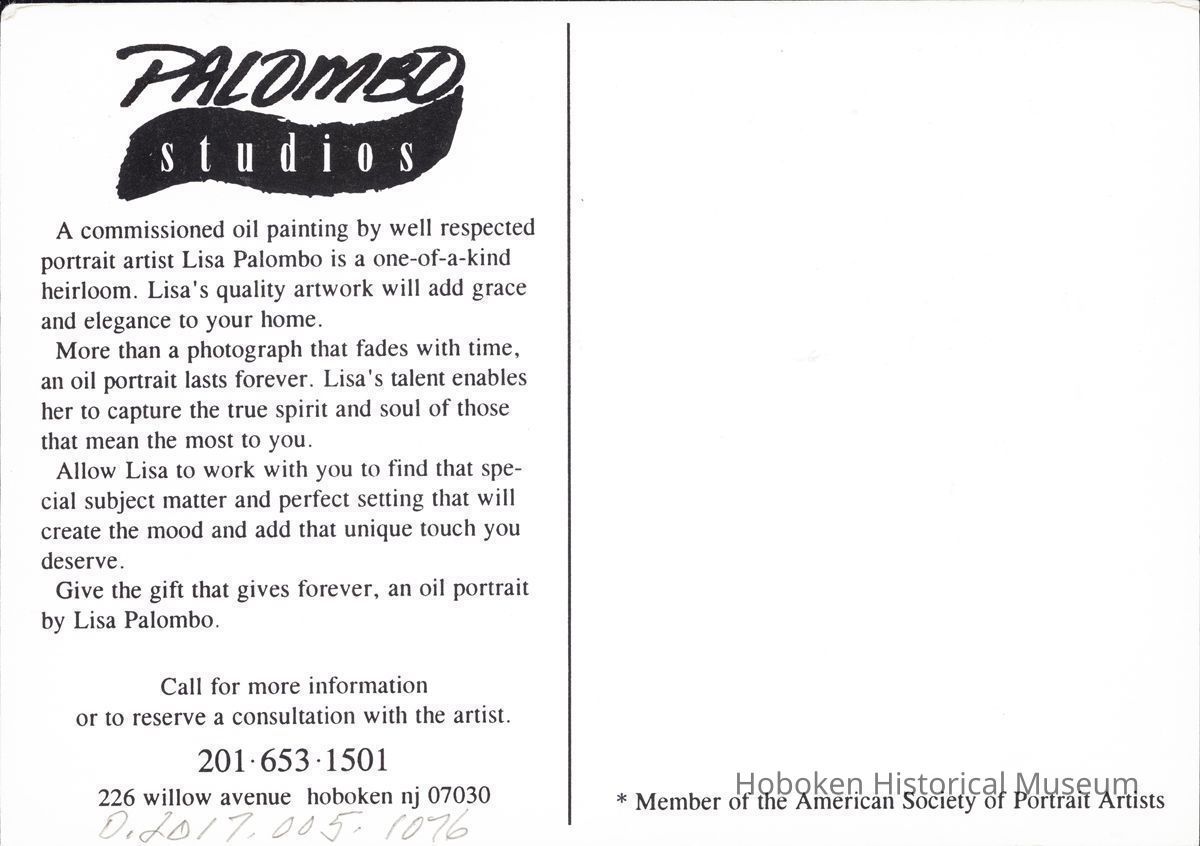 Palombo studios A commissioned oil painting by well respected portrait artist Lisa Palombo is a one-of-a-kind heirloom. Lisa's quality artwork will add grace and elegance to your home. More than a photograph that fades with time, an oil portrait lasts forever. Lisa's talent enables her to capture the true spirit and soul of those that mean the most to you. Allow Lisa to work with you to find that special subject matter and perfect setting that will create the mood and add that unique touch you deserve. Give the gift that gives forever, an oil portrait by Lisa Palombo. Call for more information or to reserve a consultation with the artist. 201-653-1501 226 willow avenue hoboken nj 07030