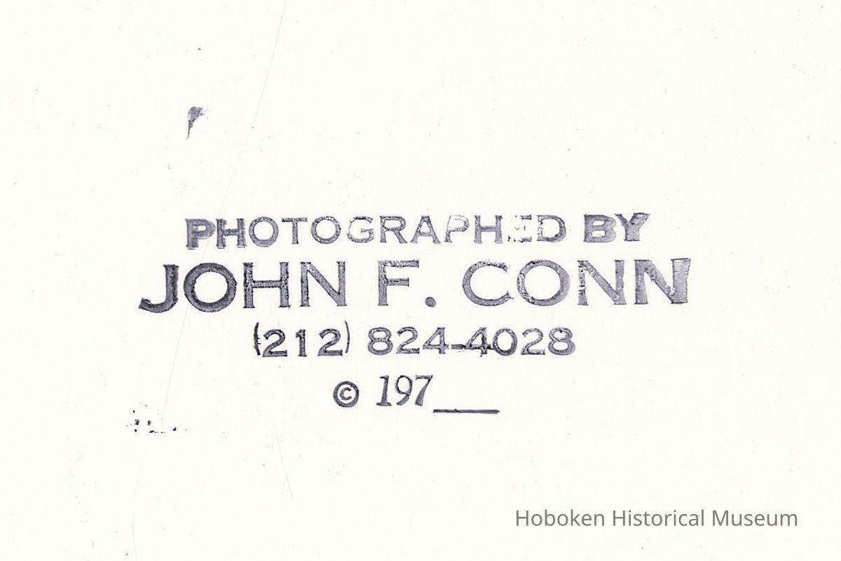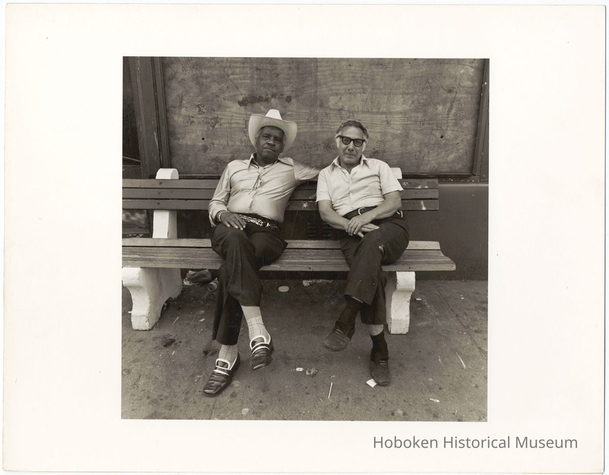 Black-and-white photo of two men seated on a city bench near a boarded-up window, Hoboken, no date, [1976]. ca. 8-1/2" square image on 11" x 14" wide print. Photograph by John F. Conn, copyright 197-. The men are not identified. Digital images only. Museum does not own the original.
