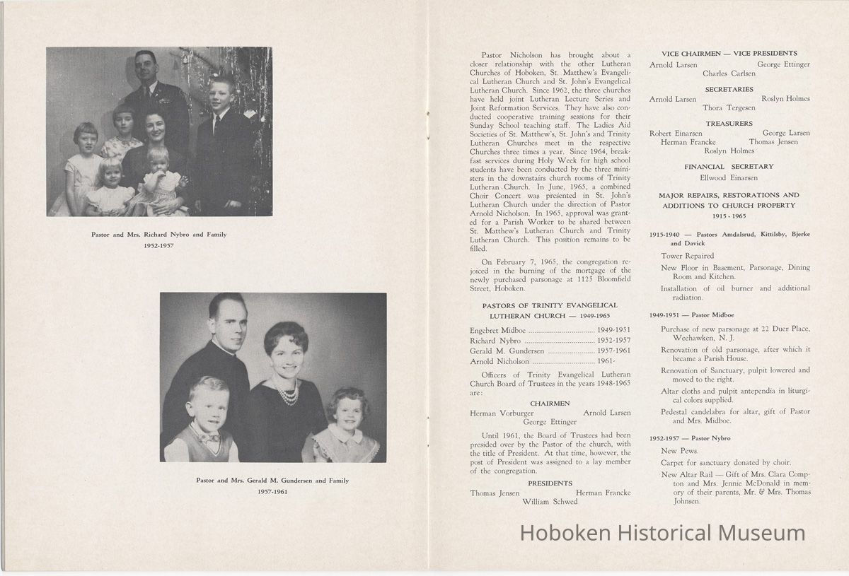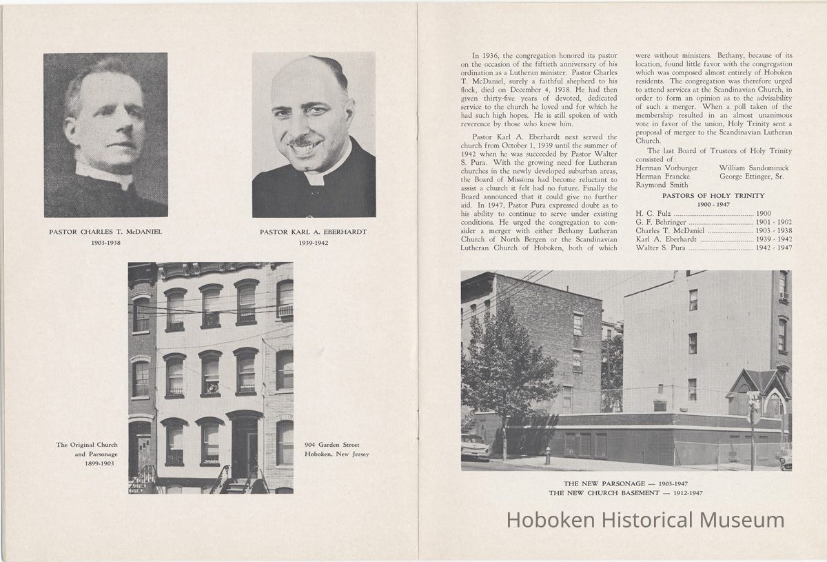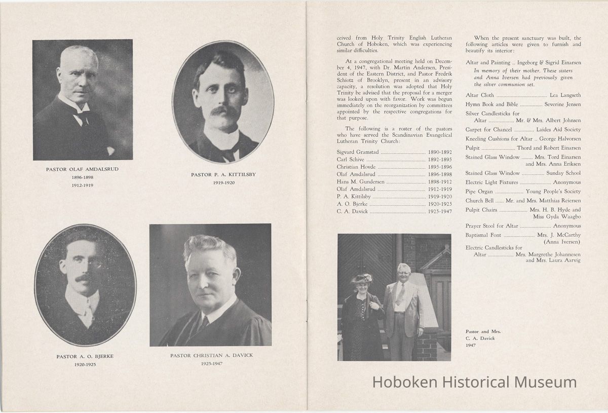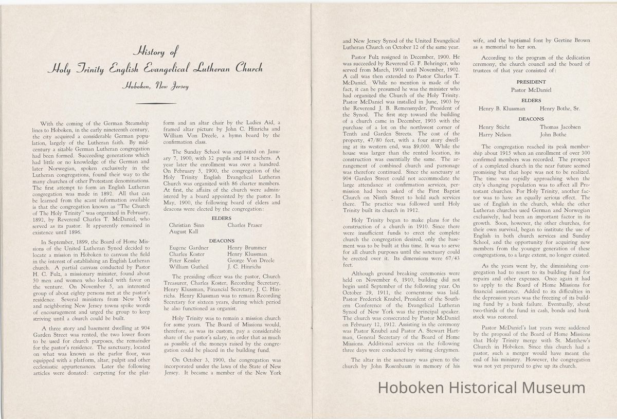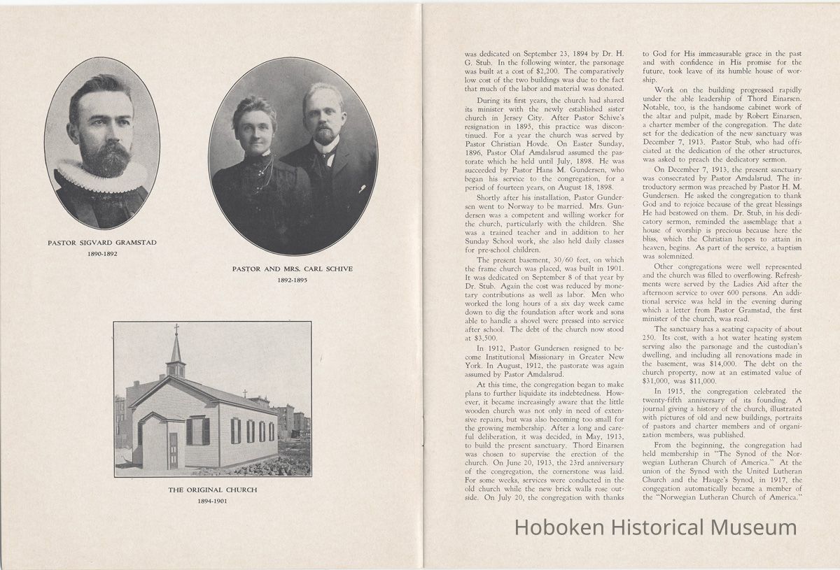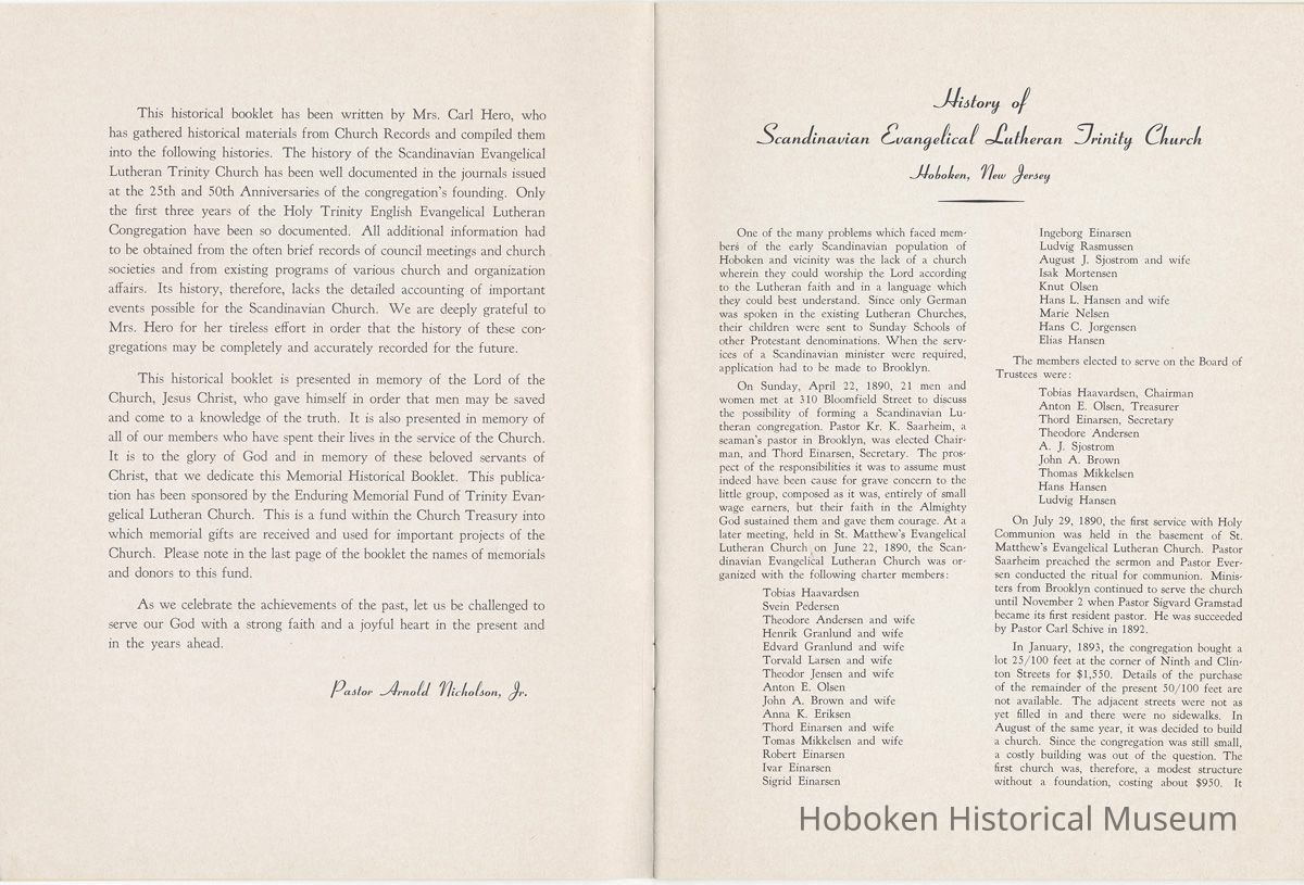 Display Value: Good Notes: Archives 2005.007.0030 [cover] 1890 1965 [drawing of church exterior by E.A. Nielsen] 75th Anniversary Memorial History of Trinity Evangelical Church Hoboken, New Jersey ==== Page [1] The Seventy-fifth Anniversary Memorial Booklet records the blessings of Almighty God and the joyful response of God’s people in the history of two Lutheran Congregations which, after many years of independent service, were led to merge, creating a third Lutheran Congregation. The Scandinavian Evangelical Lutheran Trinity Church served from 1890-1947, a period of 57 years. The Holy Trinity English Evangelical Lutheran Church served from 1900-1947, a period of 47 years. The merged Church, Trinity Evangelical Lutheran Church has served from 1948 to the present, 1965, a period of 18 years. The combination of the Church histories covers a continuous period of 75 years of service to Christ in the City of Hoboken, New Jersey. The history of the churches will challenge our hearts as we read of the faith of our fathers who sacrificed much in order that their families and friends might have a place of worship, a “House of the Lord” in their midst. ==== page [2] This historical booklet has been written by Mrs. Carl Hero, who has gathered historical materials from Church Records and compiled them into the following histories. The history of the Scandinavian Evangelical Lutheran Trinity Church has been well documented in the journals issued at the 25th and 50th Anniversaries of the congregation’s founding. Only the first three years of the Holy Trinity English Evangelical Lutheran Congregation have been so documented. All additional information had to be obtained from the often brief records of council meetings and church societies and from existing programs of various church and organisation affairs. Its history, therefore, lacks the detailed accounting of important events possible for the Scandinavian Church. We are deeply grateful to Mrs. Hero for her tireless effort in order that the history of these congregations may be completely and accurately recorded for the future. This historical booklet is presented in memory of the Lord of the Church, Jesus Christ, who gave himself in order that men may be saved and come to a knowledge of the truth. It is also presented in memory of all of our members who have spent their lives in the service of the Church. It is to the glory of God and in memory of these beloved servants of Christ, that we dedicate this Memorial Historical Booklet. This publication has been sponsored by the Enduring Memorial Fund of Trinity Evangelical Lutheran Church. This is a fund within the Church Treasury into which memorial gifts are received and used for important projects of the Church. Please note in the last page of the booklet the names of memorials and donors to this fund. As we celebrate the achievements of the past, let us be challenged to serve our God with a strong faith and a joyful heart in the present and in the years ahead. Pastor Arnold Nicholson, Jr. ==== page [3] History of Scandinavian Evangelical Lutheran Trinity Church Hoboken, New Jersey One of the many problems which faced mem bers of the early Scandinavian population of Hoboken and vicinity was the lack of a church wherein they could worship the Lord according to the Lutheran faith and in a language which they could best understand. Since only German was spoken in the existing Lutheran Churches, their children were sent to Sunday Schools of other Protestant denominations. When the services of a Scandinavian minister were required, application had to be made to Brooklyn. On Sunday, April 22, 1890, 21 men and women met at 310 Bloomfield Street to discuss the possibility of forming a Scandinavian Lutheran congregation. Pastor Kr. K. Saarheim, a seaman’s pastor in Brooklyn, was elected Chairman, and Thord Einarsen, Secretary. The prospect of the responsibilities it was to assume must indeed have been cause for grave concern to the little group, composed as it was, entirely of small wage earners, but their faith in the Almighty God sustained them and gave them courage. At a later meeting, held in St. Matthew’s Evangelical Lutheran Church on June 22, 1890, the Scandinavian Evangelical Lutheran Church was organised with the following charter members: Tobias Haavardsen Svein Pedersen Theodore Andersen and wife Henrik Granlund and wife Edvard Granlund and wife Torvald Larsen and wife Theodor Jensen and wife Anton E. Olsen John A. Brown and wife Anna K. Eriksen Thord Einarsen and wife Tomas Mikkelsen and wife Robert Einarsen Ivar Einarsen Sigrid Einarsen ---- Ingeborg Einarsen Ludvig Rasmussen August J. Sjostrom and wife Isak Mortensen Knut Olsen Hans L. Hansen and wife Marie Nelsen Hans C. Jorgensen Elias Hansen The members elected to serve on the Board of Trustees were: Tobias Haavardsen, Chairman Anton E. Olsen, Treasurer Thord Einarsen, Secretary Theodore Andersen A. J. Sjostrom John A. Brown Thomas Mikkelsen Hans Hansen Ludvig Hansen On July 29, 1890, the first service with Holy Communion was held in the basement of St. Matthew’s Evangelical Lutheran Church. Pastor Saarheim preached the sermon and Pastor Eversen conducted the ritual for communion. Ministers from Brooklyn continued to serve the church until November 2 when Pastor Sigvard Gramstad became its first resident pastor. He was succeeded by Pastor Carl Schive in 1892. In January, 1893, the congregation bought a lot 25/100 feet at the corner of Ninth and Clinton Streets for $1,550. Details of the purchase of the remainder of the present 50/100 feet are not available. The adjacent streets were not as yet filled in and there were no sidewalks. In August of the same year, it was decided to build a church. Since the congregation was still small, a costly building was out of the question. The first church was, therefore, a modest structure without a foundation, costing about $950. It ==== page [4] [photo] PASTOR SIGVARD GRAMSTAD 1890-1892 [