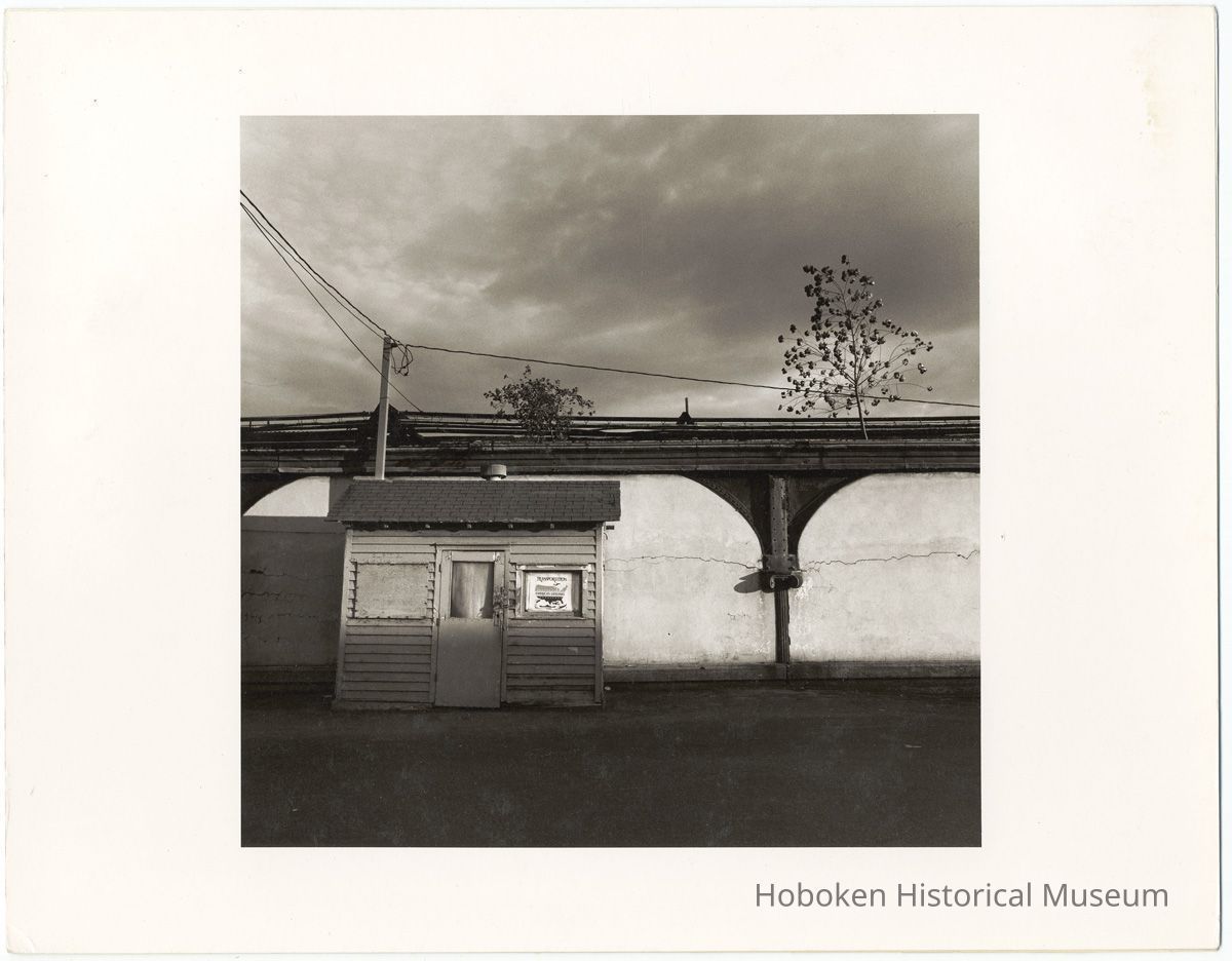 Black-and-white photo of the north wall of the passenger train tracks and a small office shed along the bus entrance drive from Observer Highway, Hoboken, no date, [1976]. ca. 8-1/2" square image on 11" x 14" wide print. Photograph by John F. Conn, copyright 197-. People are not identified. Digital images only. Museum does not own the original.
