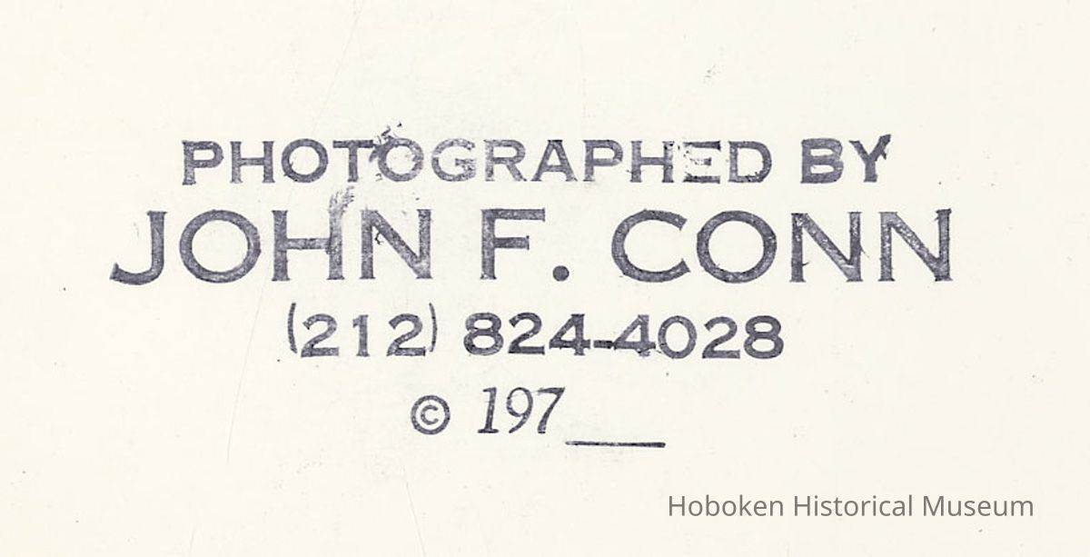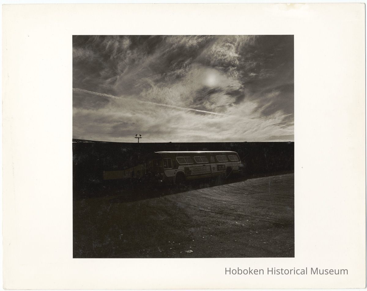 Black-and-white photo of the north wall of the passenger train tracks seen from the north side along the bus entrance drive from Observer Highway, Hoboken, no date, [1976]. ca. 8-1/2" square image on 11" x 14" wide print. Photograph by John F. Conn, copyright 197-. People are not identified. Digital images only. Museum does not own the original.