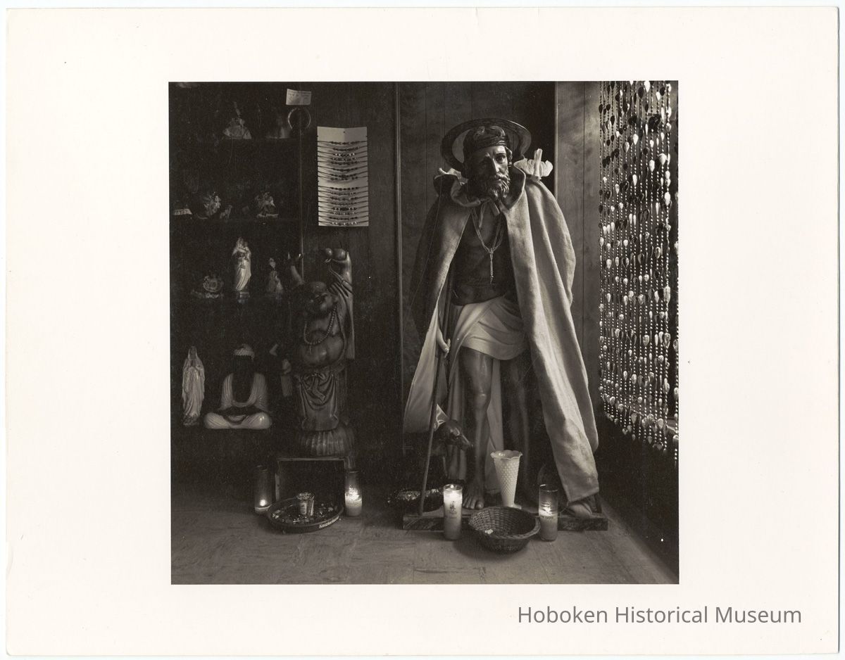 B+W photo of a religious shrine with representation of eastern & western figures, lit candles, Hoboken, no date, [1976].