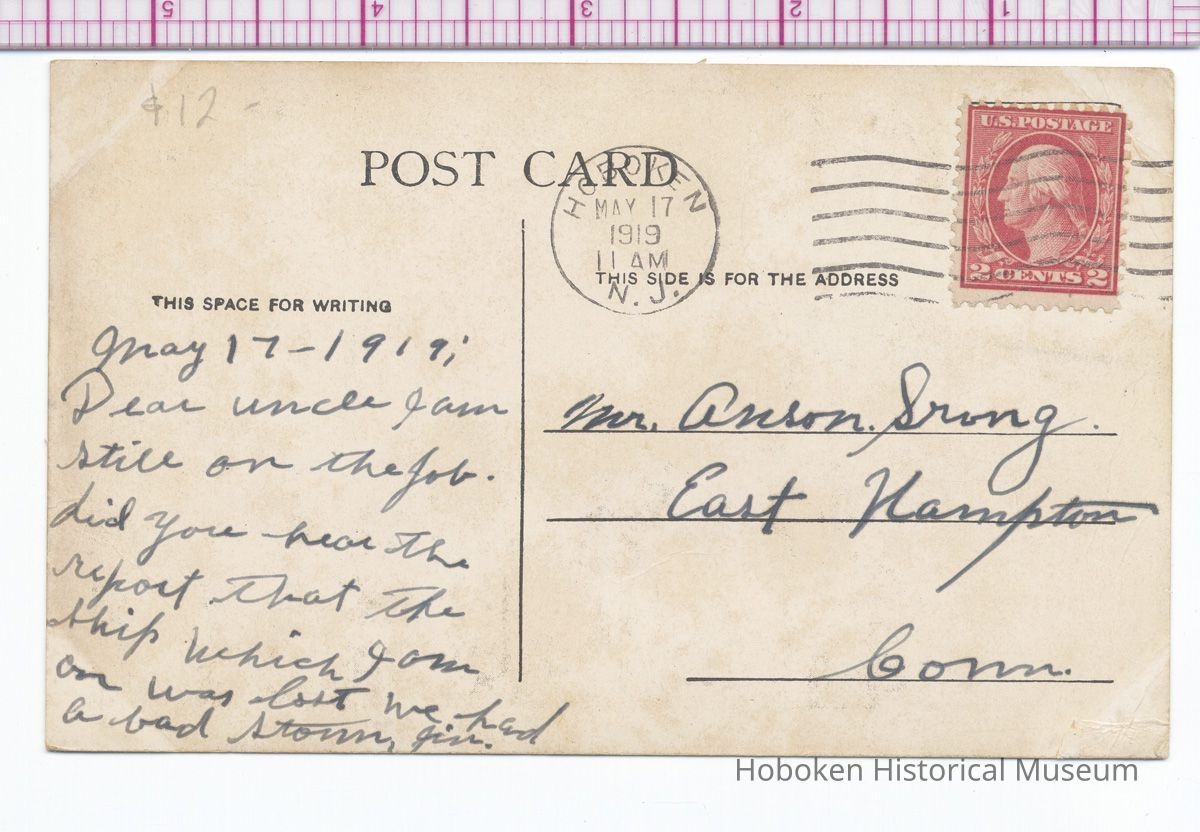 Postcard: 3217 - Library & Reading Room, Y.M.C.A. Hudson Hut, Hoboken, N.J. Postmarked May 17, 1919.