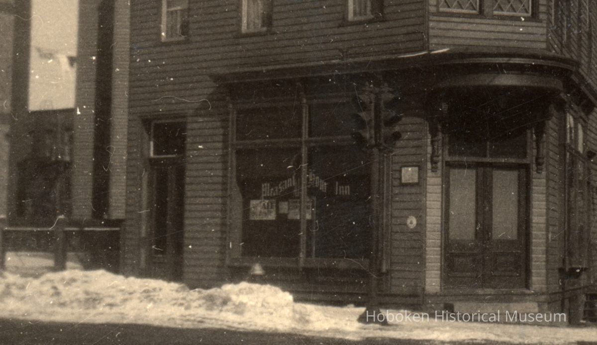 View of the exterior of two-story bar / restaurant with entrance at corner (note streets do not meet at right angle as seen by building shape which may place this site in the southeast corner of Hoboken) with gothic lettering on windows.