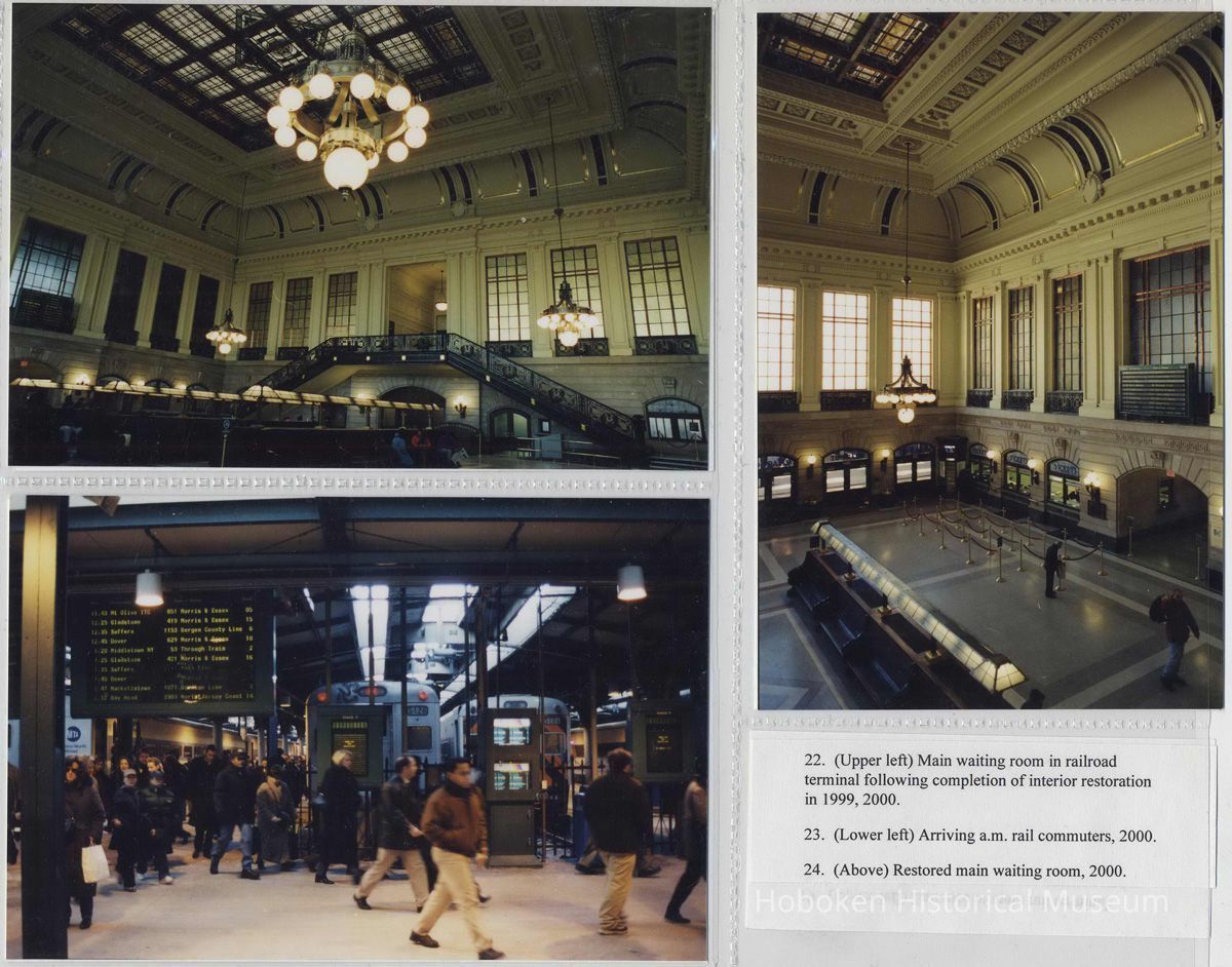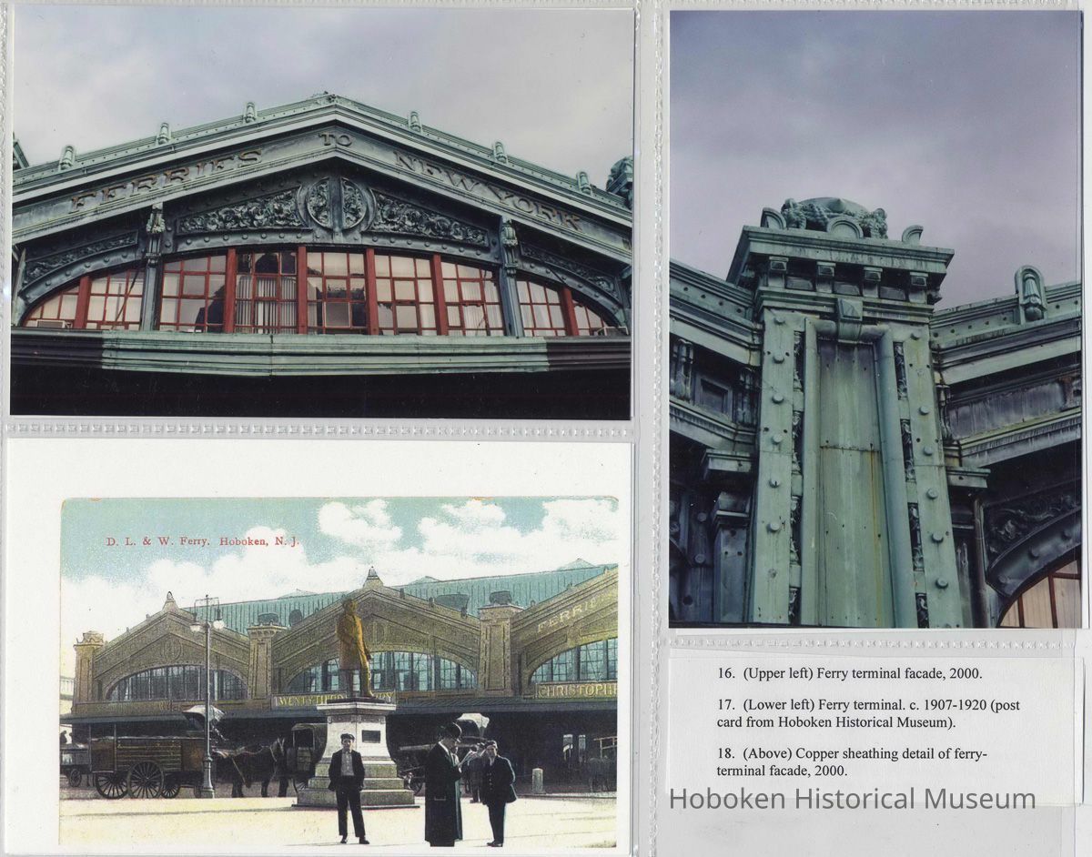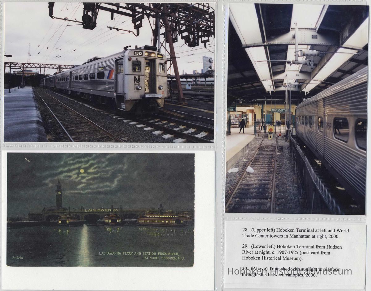 Digital color images of 36 color photos or postcard images of the Hoboken Terminal, Hoboken, circa 1907-2000. Photographs taken 2000; photographer not identified. Item as assembled circa 2001 in six plastic storage sleeves with numbers and typed captions. Tiffs media archive