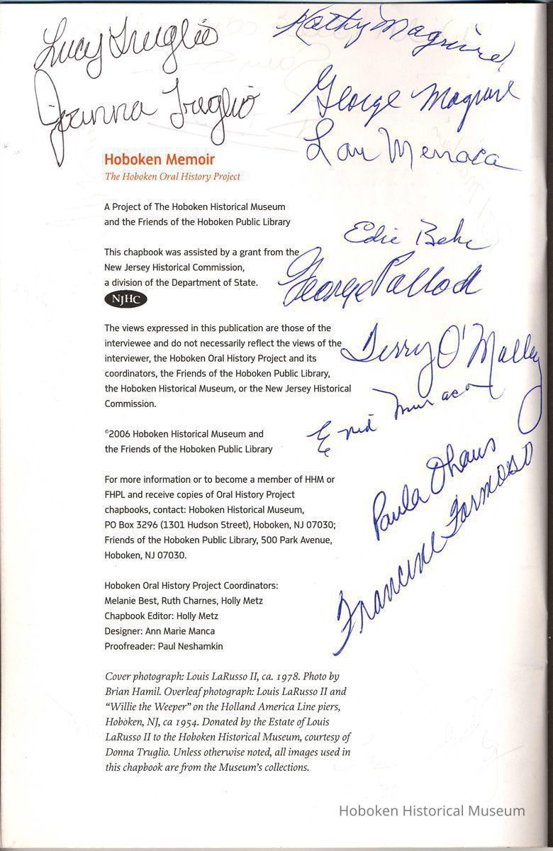 Oral history chapbook "The Simple Dialogue of My People: Recollections of Hoboken Playwright Louis LaRusso II" signed by some attendees at Louis LaRusso event at Hoboken Historical Museum, Hoboken, January 29, 2006.