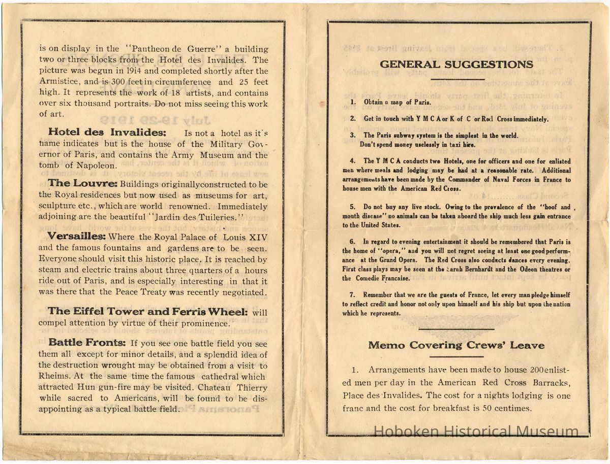 The Paris Leave pamphlet was apparently a stock promotional brochure issued by the Panorama Picture of the War which was a commercial tourist site and was customized for a ship's party as seen by the title and instructions on page [4], This place is the first one mentioned at the bottom of page [1] of places to visit.