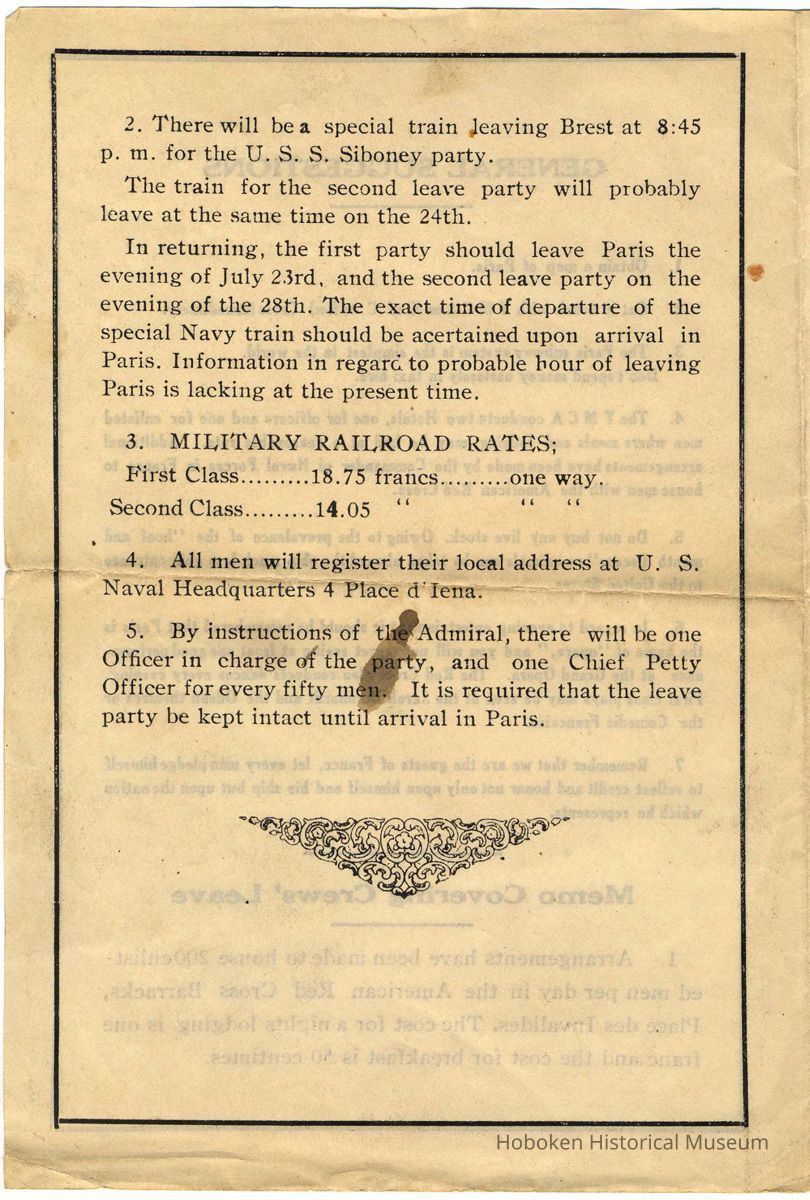 cf. 2006.012.0000 (and 'related') for list of ephemera in this group and background on the vessel as provided by a dealer of this material. (The Siboney, part of the Cruiser and Transport fleet of World War I, is known to have docked at Hoboken (Port of Embarkation and Debarkation) on May 15, 1918 and departed on the 16th for Virginia.)