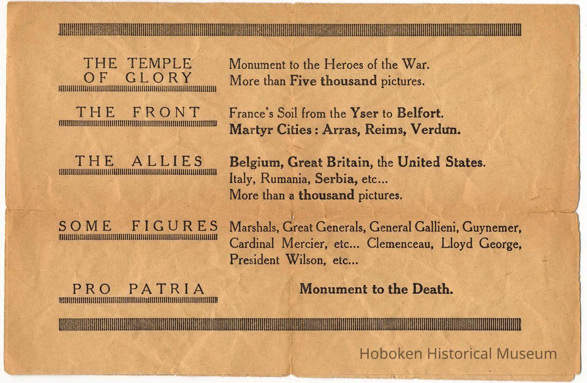 Pamphlet: The U.S.S. Siboney's Paris Leave. July 19-29, 1919. Pamphlet, 4" wide x 7" high, [4] pp. With: promotional flyer for Pantheon of the War, Paris, no date, (1919). Typical of items that military personnel would receive when on leave.