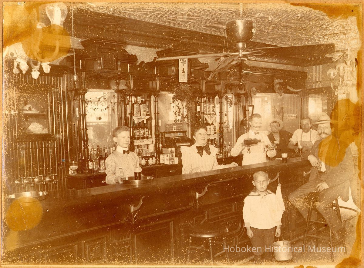 Digital image of sepia-tone photo of a New York City bar interior with John Muller standing behind bar at the left, New York, no date, ca. 1903-1905. Photographer's stamp, M. Bock, 1519 First Avenue, New York City, on the reverse of mount. Other people are not identified.