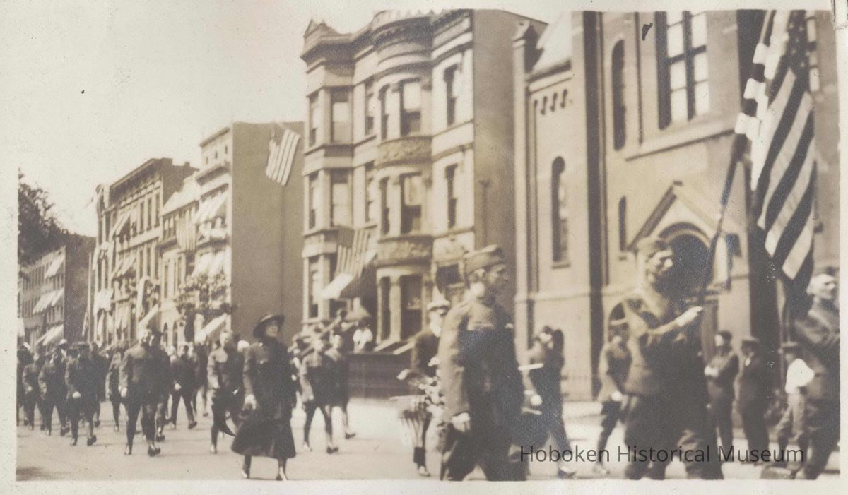 Digital image of sepia-tone photo of a Hudson Street parade with soldiers and a woman marching, Hoboken, no date, ca. 1920-25. Photographer not known, probably John Muller. None of the people are identified. Church on the right is St. Matthew Trinity Lutheran at 8th & Hudson.