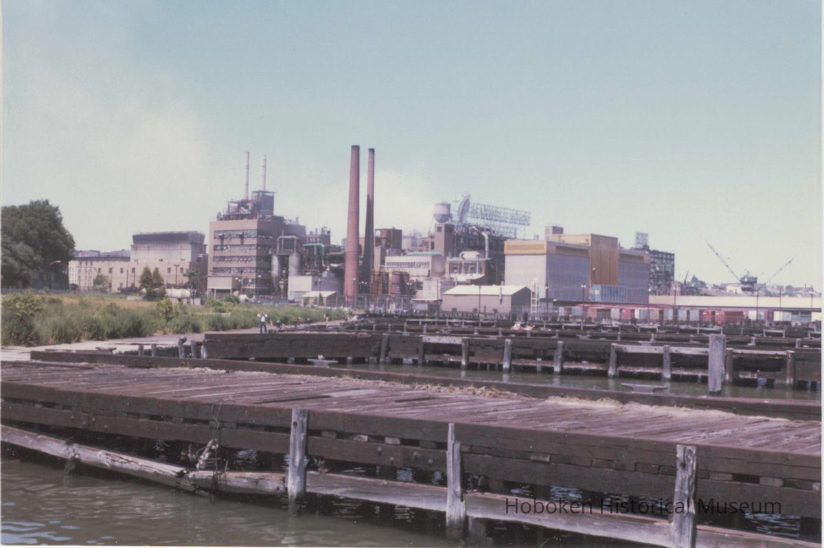 The plant was demolished in 2004. The view is looking northwest. At the right background are traveling cranes on piers at the Hoboken Shipyard, once the Bethlehem Steel Shipyard, and at this time owned by the Braswell Corporation, which ceased Hoboken operations in 1982. To the left of the cranes is the Lipton Tea building which has a sign atop it. The piers in the foreground became the Union Dry Dock & Repair Company facility which came to Hoboken ca. 1983-84. At the left, the large tree is in Elysian Park.