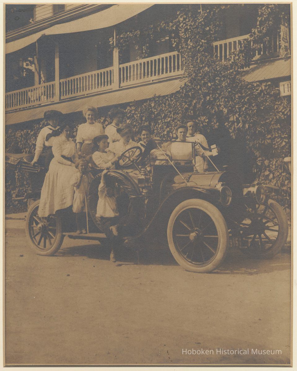Digital image of sepia-tone photo of eight women, two girls and boy on the Muller family car outside an unidentified hotel or inn, no place, no date, ca. 1910-20. Photographer not known, probably John Muller. None of the people are identified. The automobile probably was Muller's as it can be seen in other images from this era. Reverse is blank.