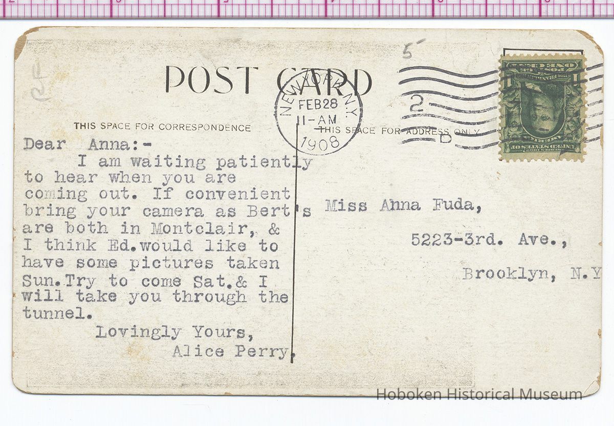 Postcard: Tunnel under the Hudson River connecting Jersey City and Hoboken with New York City. Postmarked Feb. 28, 1908.