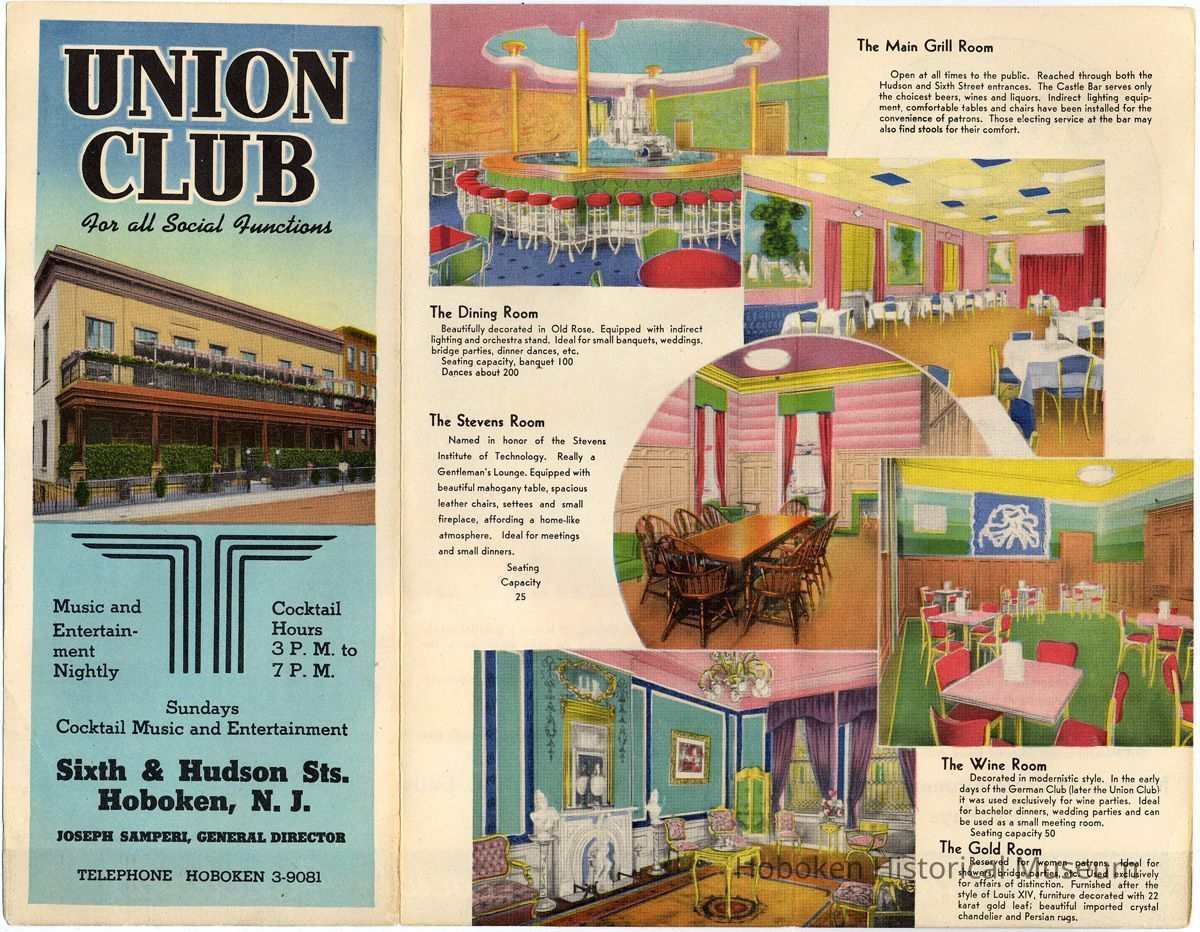 Brochure for the Union Club, 6th and Hudson Sts, Hoboken, no date, ca. 1950. Single leaf, 8-3/16" high x 10-5/8" wide, folded twice to 3-5/8" wide. Printed in color one side; black-and-white on the other side.