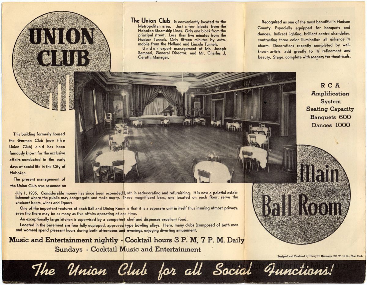 Brochure for the Union Club, 6th and Hudson Sts, Hoboken, no date, ca. 1950.