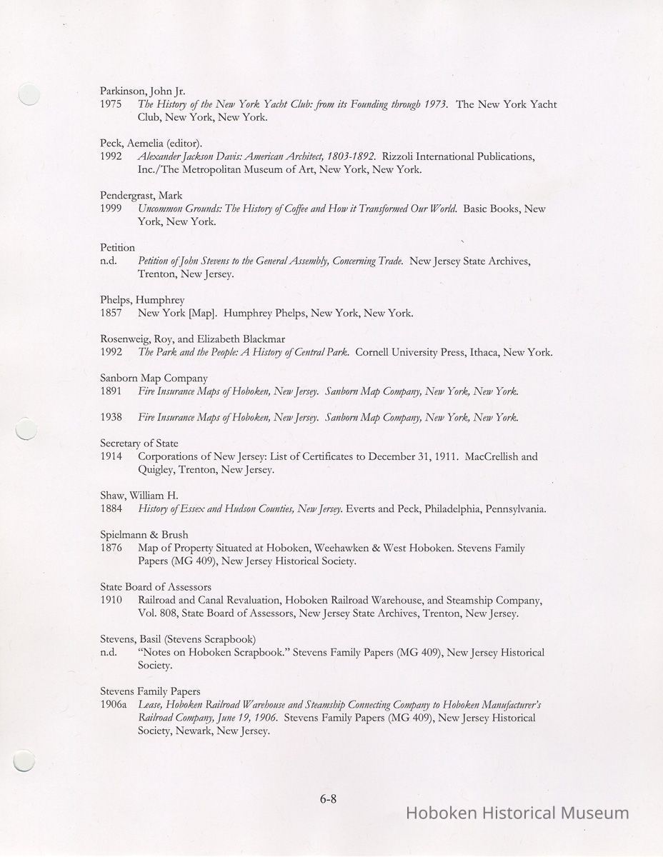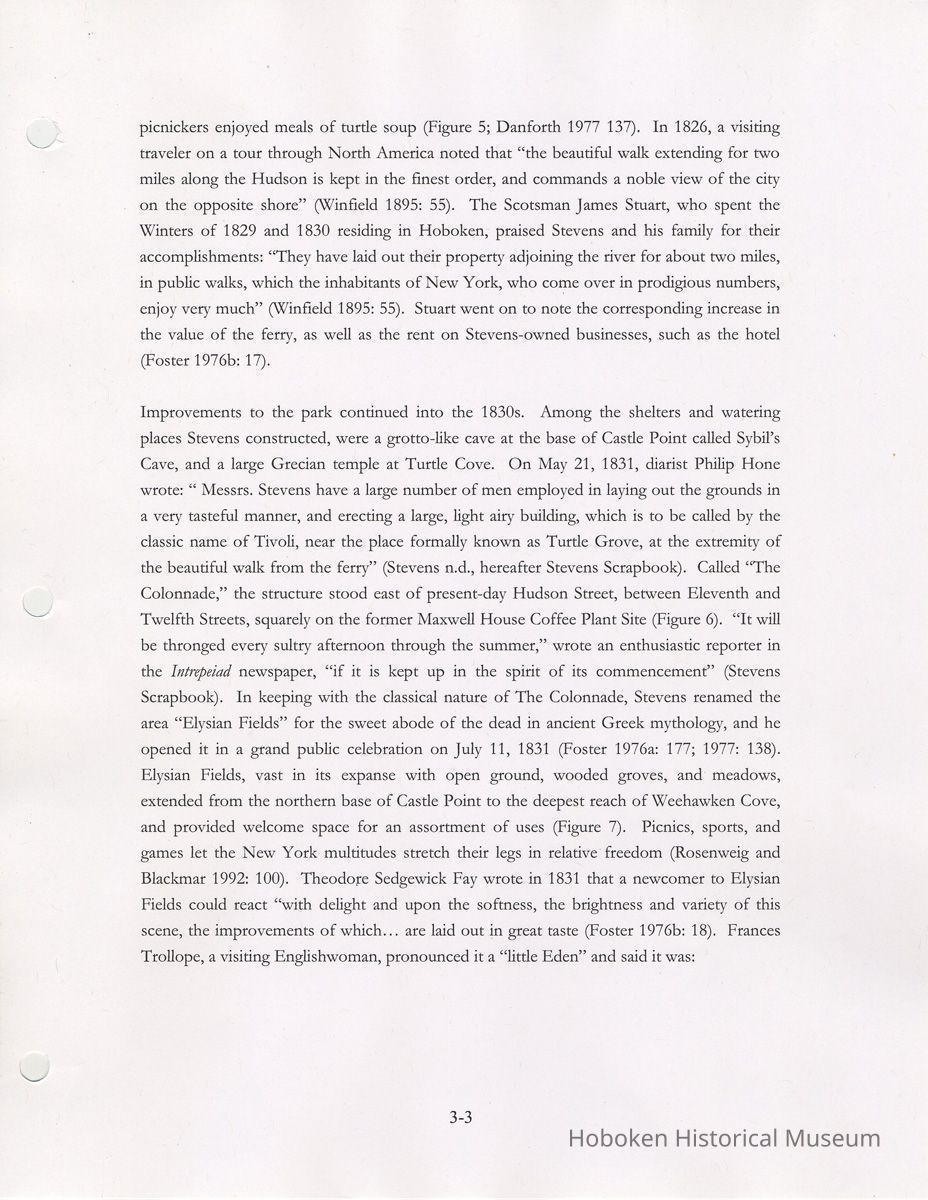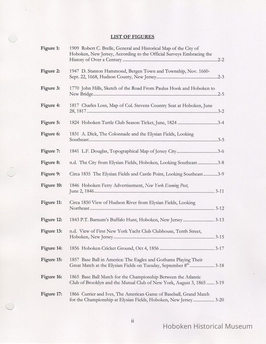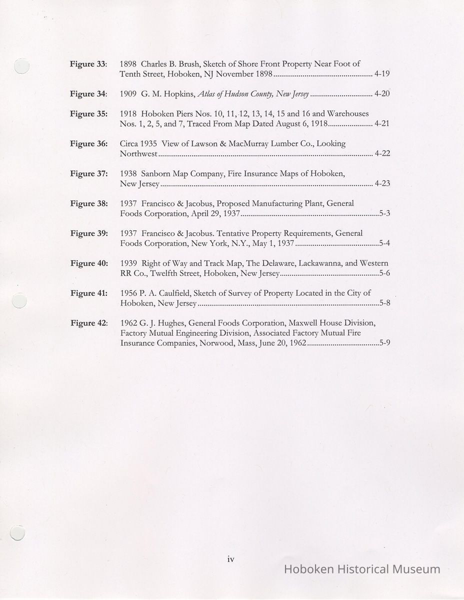 Display Value: Fair Notes: LIST OF FIGURES with page number at end Figure 1: 1909 Robert C. Brelle, General and Historical Map of the City of Hoboken, New Jersey, According to the Official Surveys Embracing the History of Over a Century 2-2 Figure 2: 1947 D. Stanton Hammond, Bergen Town and Township, Nov. 1660- Sept. 22, 1668, Hudson County, New Jersey 2-3 Figure 3: 1770 John Hills, Sketch of the Road From Paulus Hook and Hoboken to New Bridge 2-5 Figure 4: 1817 Charles Loss, Map of Col. Stevens Country Seat at Hoboken, June 28, 1817 3-2 Figure 5: 1824 Hoboken Turtle Club Season Ticket, June, 1824 3-4 Figure 6: 1831 A. Dick, The Colonnade and the Elysian Fields, Looking Southeast 3-5 Figure 7: 1841 LF. Douglas, Topographical Map of Jersey City 3-6 Figure 8: n.d. The City from Elysian Fields, Hoboken, Looking Southeast 3-8 Figure 9: Circa 1835 The Elysian Fields and Castle Point, Looking Southeast 3-9 Figure 10: 1846 Hoboken Ferry Advertisement, New York Evening Post, June 2, 1846 3-11 Figure 11: Circa 1850 View of Hudson River from Elysian Fields, Looking Northeast 3-12 Figure 12: 1843 P.T. Barnum's Buffalo Hunt, Hoboken, New Jersey 3-13 Figure 13: n.d. View of First New York Yacht Club Clubhouse, Tenth Street, Hoboken, New Jersey 3-15 Figure 14: 1856 Hoboken Cricket Ground, Oct 4, 1856 3-17 Figure 15: 1857 Base Ball in America: The Eagles and Gothams Playing Their Great Match at the Elysian Fields on Tuesday, September 8th 3-18 Figure 16: 1865 Base Ball Match for the Championship Between the Atlantic Club of Brooklyn and the Mutual Club of New York, August 3, 1865 3-19 Figure 17: 1866 Currier and Ives, The American Game of Baseball, Grand Match for the Championship at Elysian Fields, Hoboken, New Jersey 3-20 Figure 18: 1866 Bachman, Birds Eye View of New York City 3-23 Figure 19: 1946 View of Original Baseball Commemorative Plaque with Maxwell House Central Office and Laboratory Building in Background, Eleventh and Hudson Streets 3-24 Figure 20: 1848 A. Clark, Map of Hudson County, State of New Jersey, Made for William H. Leupp, Martin J. Ryerson, George F. Fort, Commissioners Appointed Under Act of Senate, February 24, 1848. Department of War, August 22, 1848 4-2 Figure 21: 1876 Spielmann & Brush, Map of Property Situated at Hoboken, Weehawken & West Hoboken 4-4 Figure 22: 1881 0. H. Bailey and Thomas Hughes, The City of Hoboken, New Jersey, 1881 4-5 Figure 23: 1865 R. C. Bacot and Thomas Hughes, Map Showing the Survey of Lands Lying Under Water of the Hudson River and Bay of New York and of Lands Adjacent Thereto, Section 5 4-7 Figure 24: 1886 Survey of Riparian Grants to Martha B. Stevens and Mary P. Lewis 4-8 Figure 25: Circa 1885 View of New Jersey Yacht Club Anchorage 4-9 Figure 26: Circa 1890 View of New Jersey Yacht Club Anchorage 4-10 Figure 27: 1889 Charles B. Brush, Sketch Showing Location of Property Referred to in Accompanying Description, Hoboken, Hudson Co., N.J. August 2, 1889 4-11 Figure 28: 1891 Sanborn Map Company, Fire Insurance Map of Hoboken, New Jersey 4-12 Figure 29: 1895 Charles B. Brush, Sketch Showing Property Belonging to Mrs. Martha B. Stevens at Tenth St and Hudson River, Hoboken, Hudson Co. N.J., Dec 1895 4-13 Figure 30: Circa 1896 Charles B. Brush. Map of the City of Hoboken, New Jersey 1891, Revised circa 1896 4-15 Figure 31: 1895 Hoboken Railroad Warehouse and Steamship Connecting Co., Survey of Route, September 17, 1895 4-16 Figure 32: 1904 Hughes and Bailey, City of Hoboken, New Jersey 4-17 Figure 33: 1898 Charles B. Brush, Sketch of Shore Front Property Near Foot of Tenth Street, Hoboken, NJ November 1898 4-19 Figure 34: 1909 G. M. Hopkins, At/as of Hudson County, New Jerseyj 4-20 Figure 35: 1918 Hoboken Piers Nos. 10, 11,12, 13, 14, 15 and 16 and Warehouses Nos. 1, 2, 5, and 7, Traced From Map Dated August 6, 1918 4-21 Figure 36: Circa 1935 View of Lawson & MacMurray Lumber Co., Looking Northwest 4-22 Figure 37: 1938 Sanborn Map Company, Fire Insurance Maps of Hoboken, New Jersey 4-23 Figure 38: 1937 Francisco & Jacobus, Proposed Manufacturing Plant, General Foods Corporation, April 29, 1937 5-3 Figure 39: 1937 Francisco & Jacobus. Tentative Property Requirements, General Foods Corporation, New York, N.Y., May 1, 1937 5-4 Figure 40: 1939 Right of Way and Track Map, The Delaware, Lackawanna, and Western RR Co., Twelfth Street, Hoboken, New Jersey 5-6 Figure 41: 1956 P. A. Caulfield, Sketch of Survey of Property Located in the City of Hoboken, New Jersey 5-8 Figure 42: 1962 G. J. Hughes, General Foods Corporation, Maxwell House Division, Factory Mutual Engineering Division, Associated Factory Mutual Fire Insurance Companies, Norwood, Mass, June 20, 1962 5-9 Status: OK Status By: dw Status Date: 2004-07-06