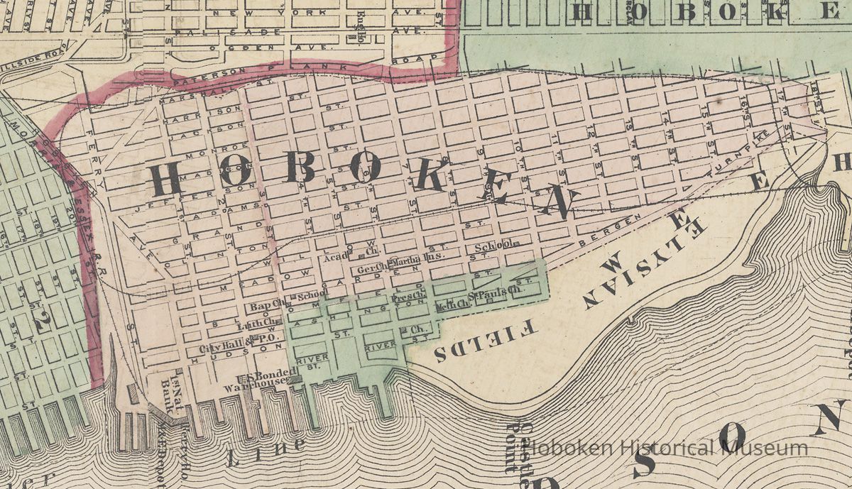 Map: Cities of Hoboken & Jersey City, Townships of West Hoboken & Weehawken & Town of Union. From: F.W. Beers' Atlas of New Jersey, 1872 or 1876 printing.