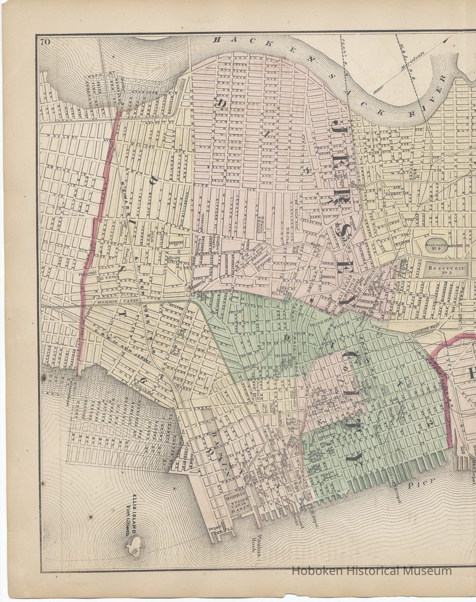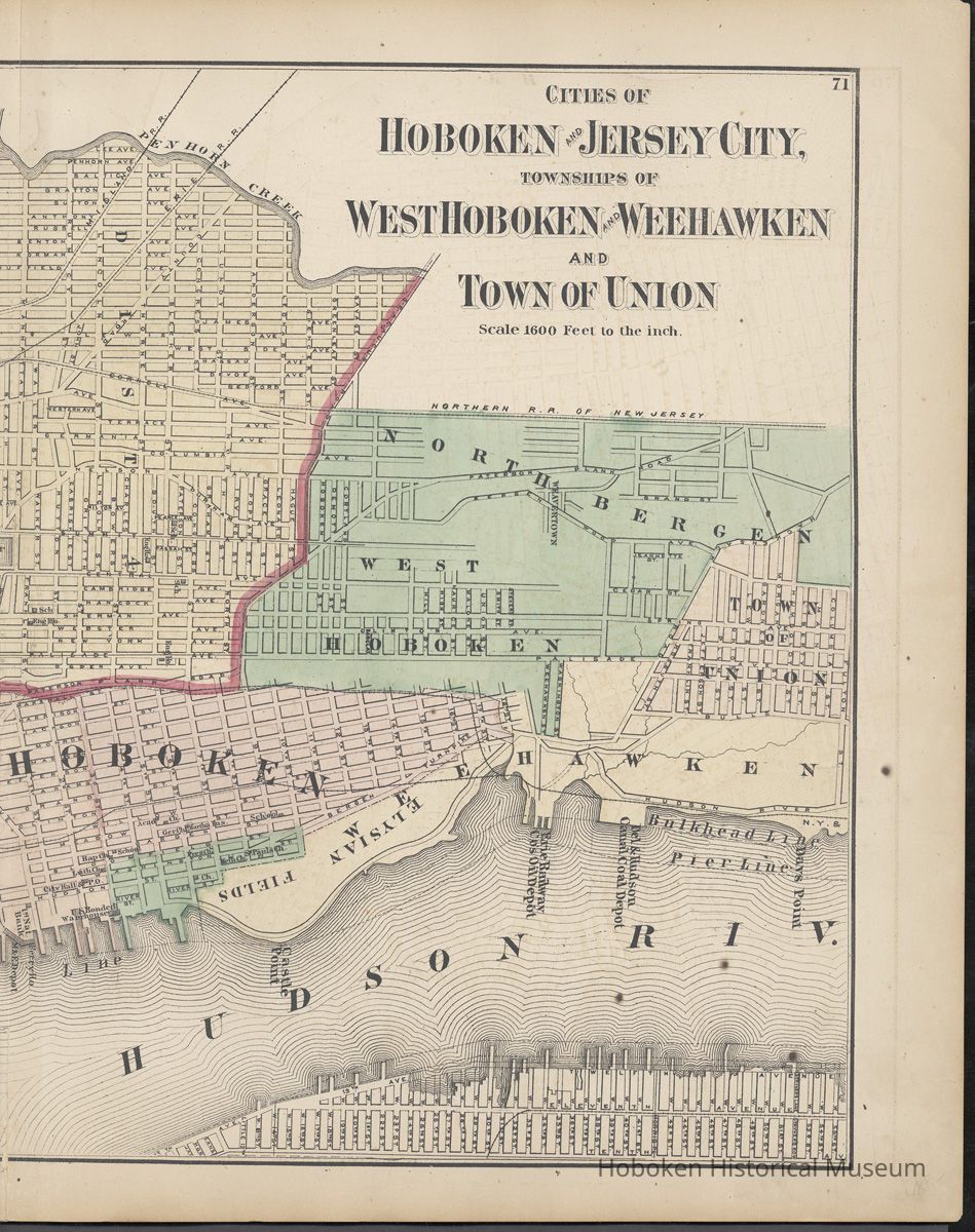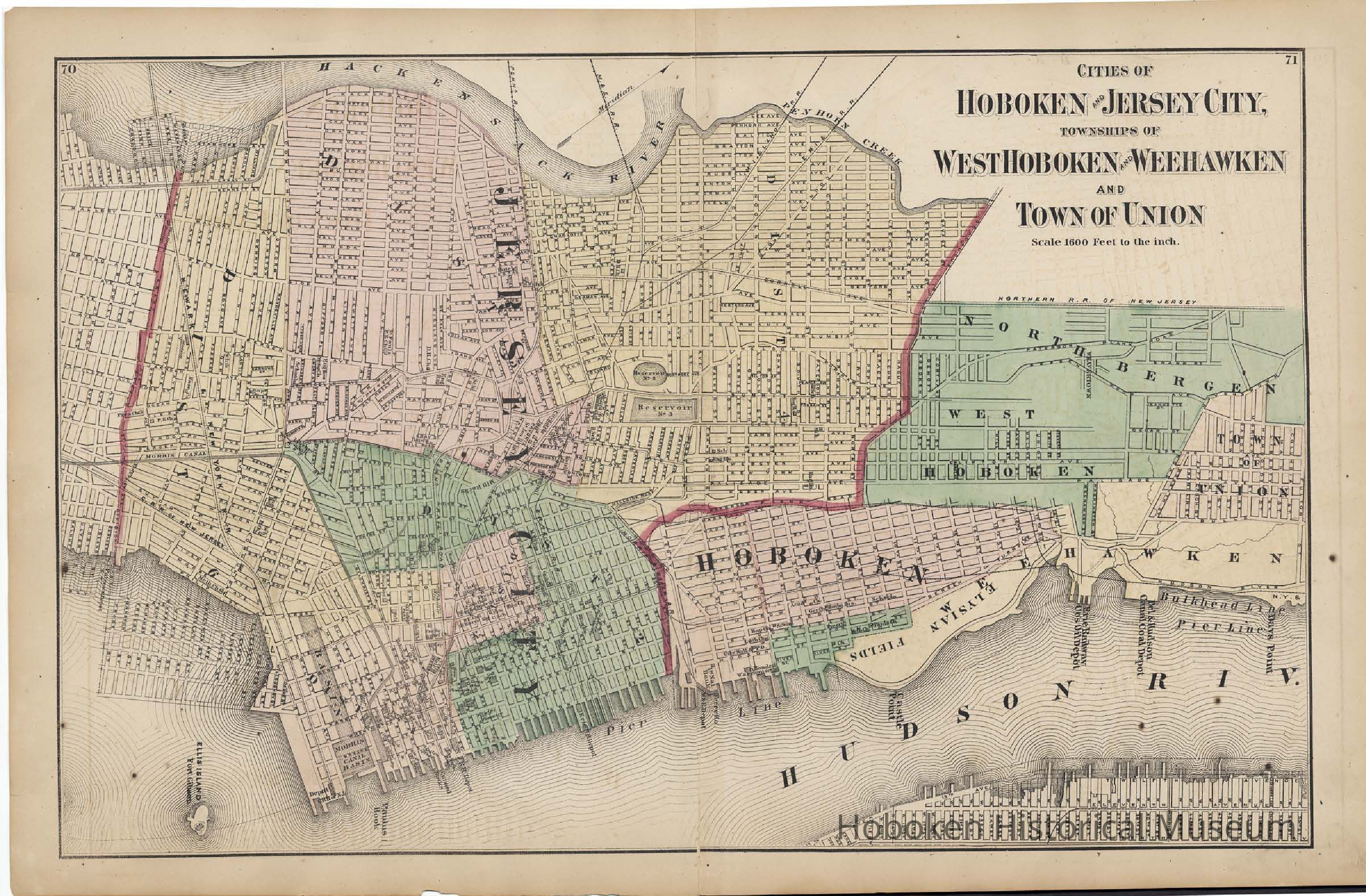 Map: Cities of Hoboken and Jersey City, Townships of West Hoboken and Weehawken and Town of Union. Pages 70-71 for Atlas of New Jersey. Published by F.W. Beers, 1872 or 1876 printing.