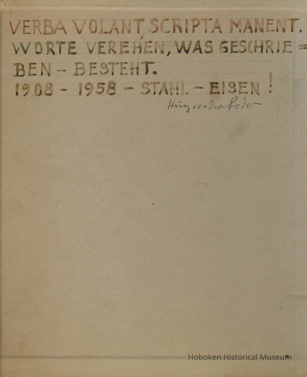 Inside front cover: Verba Volant, Scripta Manent. Worte Veheren, Was Geshrieben - Besteht. 1908-1908 - Stahl - Eisen! [signature below]