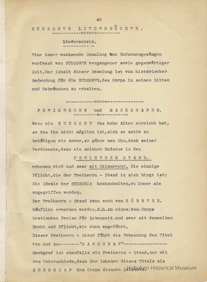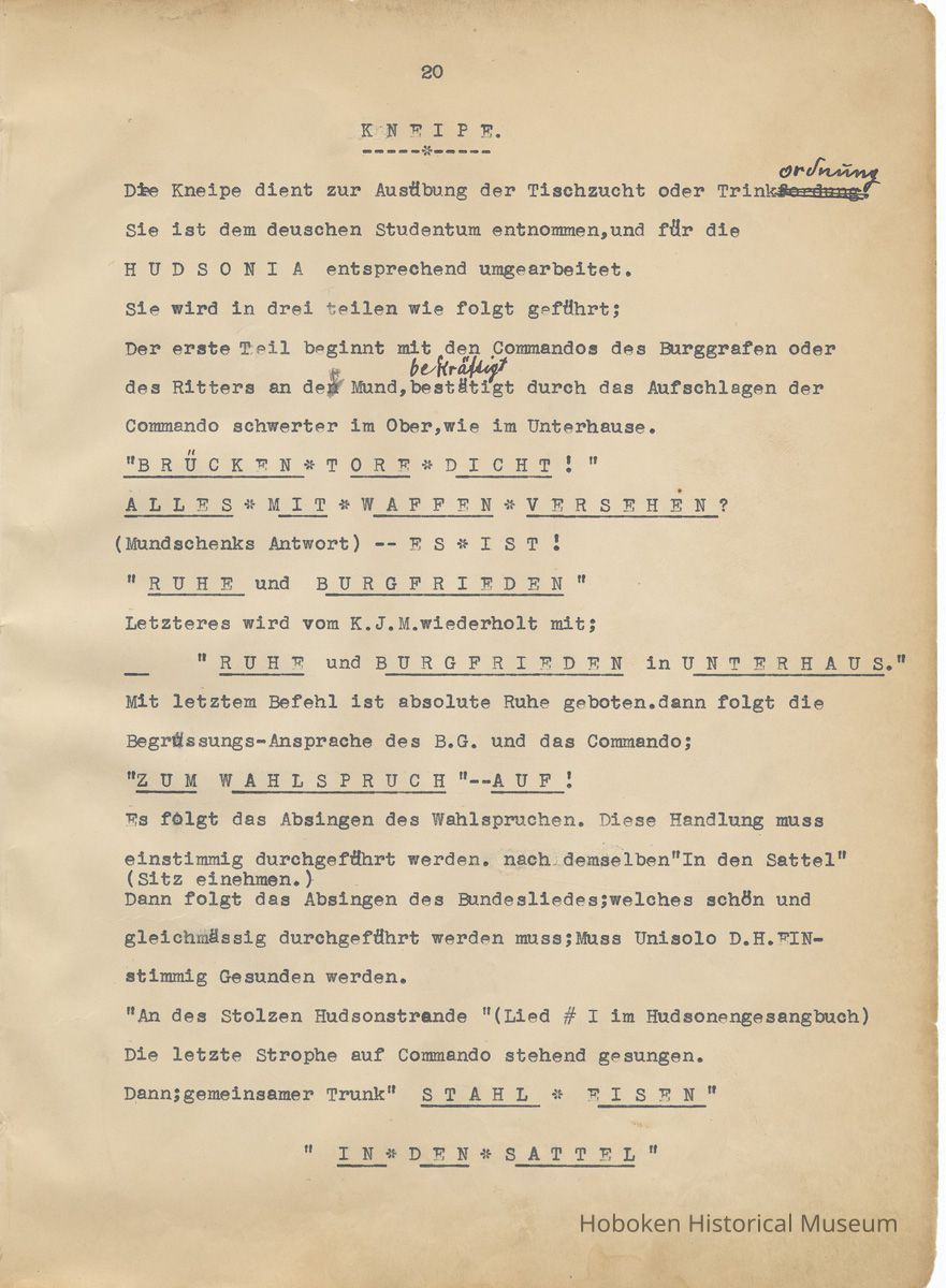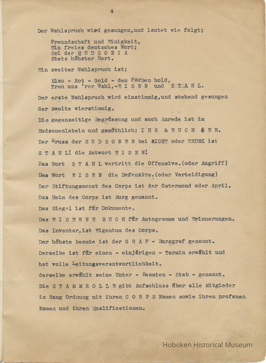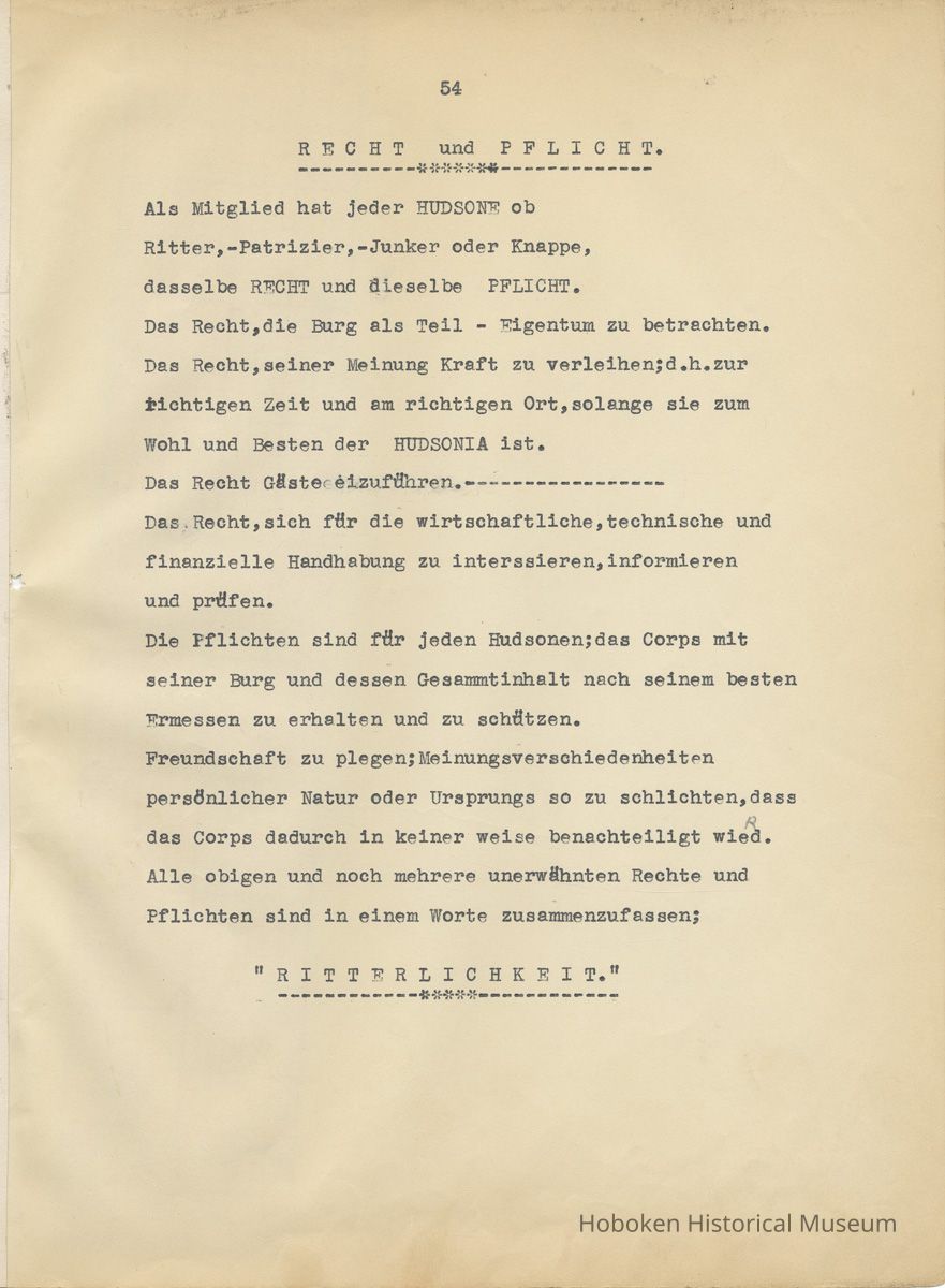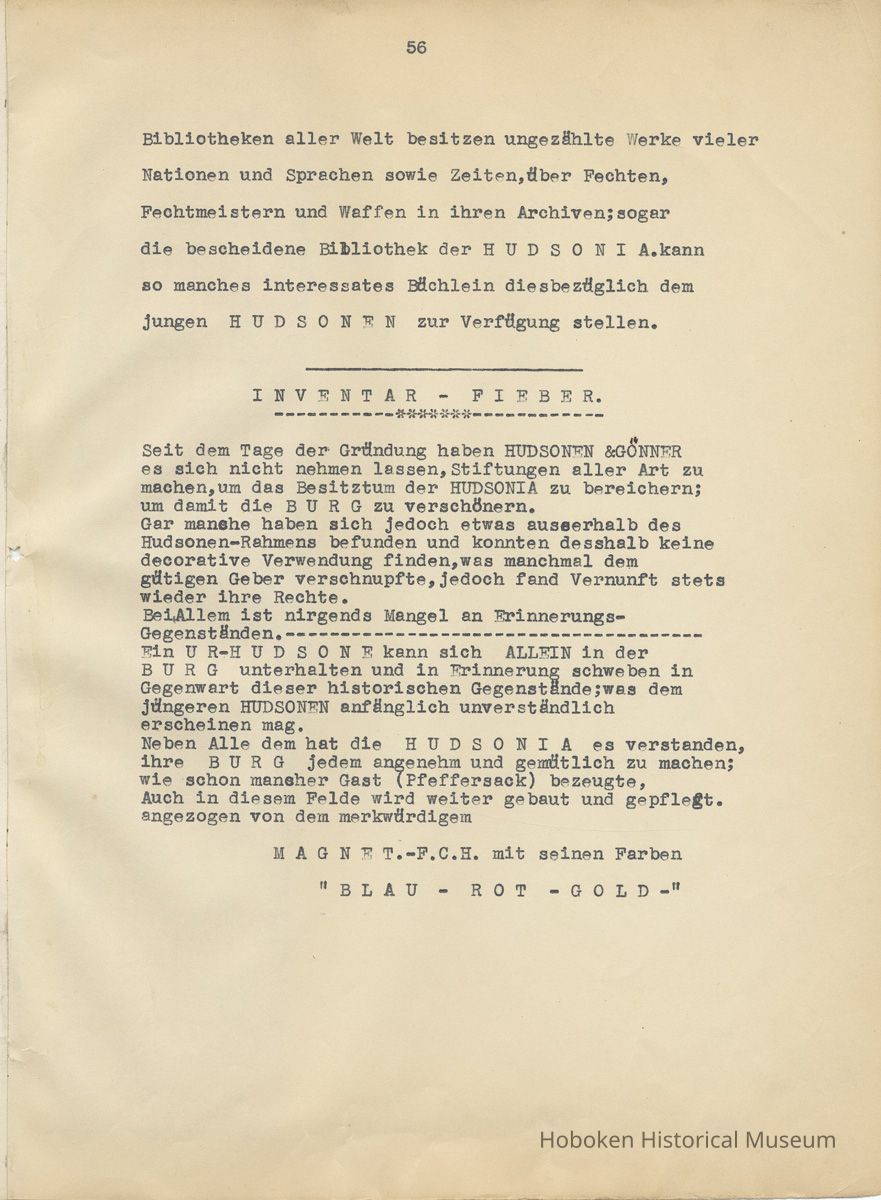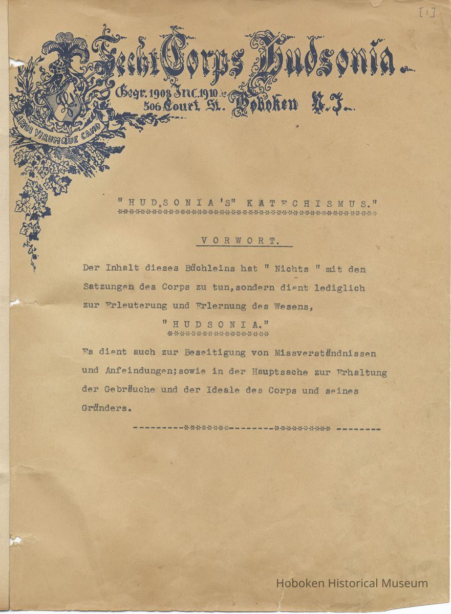 History of the Hudsonia Club 1908-1958; 506 Court St., Hoboken, 1958. 67 typewritten leaves, two-hole punched and reinforced; with a two ring canvas covered binder with hand titled and decorated front board. In German, untranslated, with holographic corrections, annotations and deletions. PDF on file.