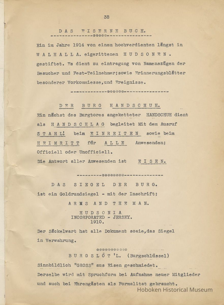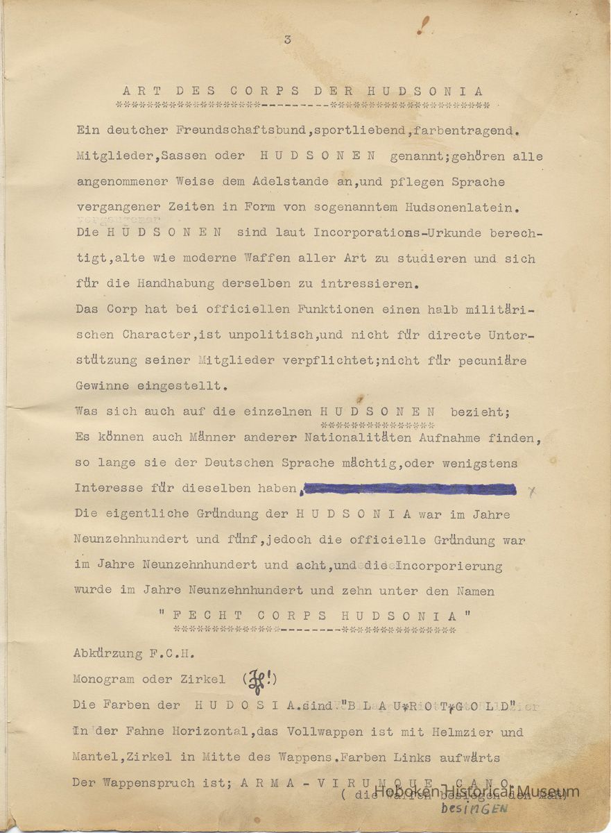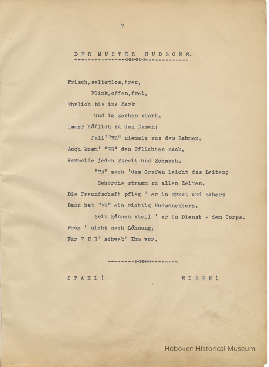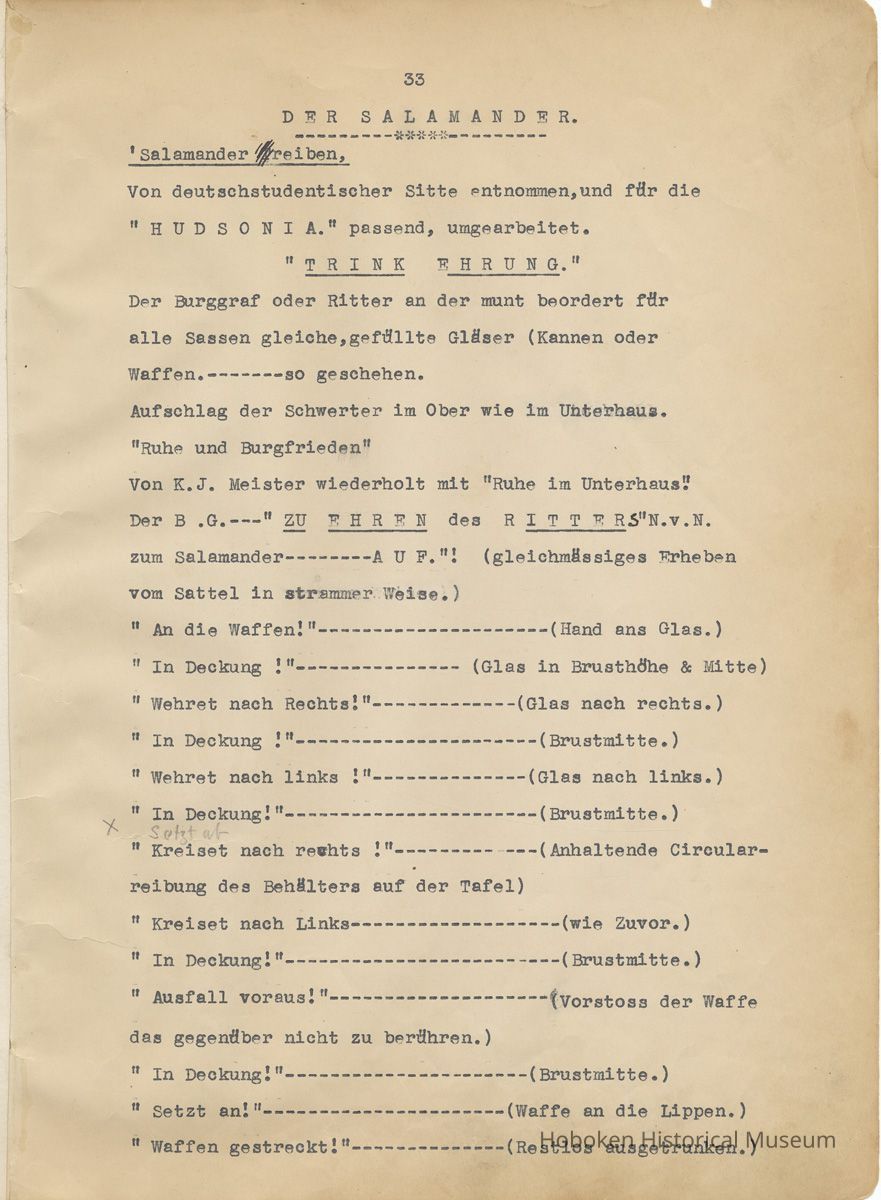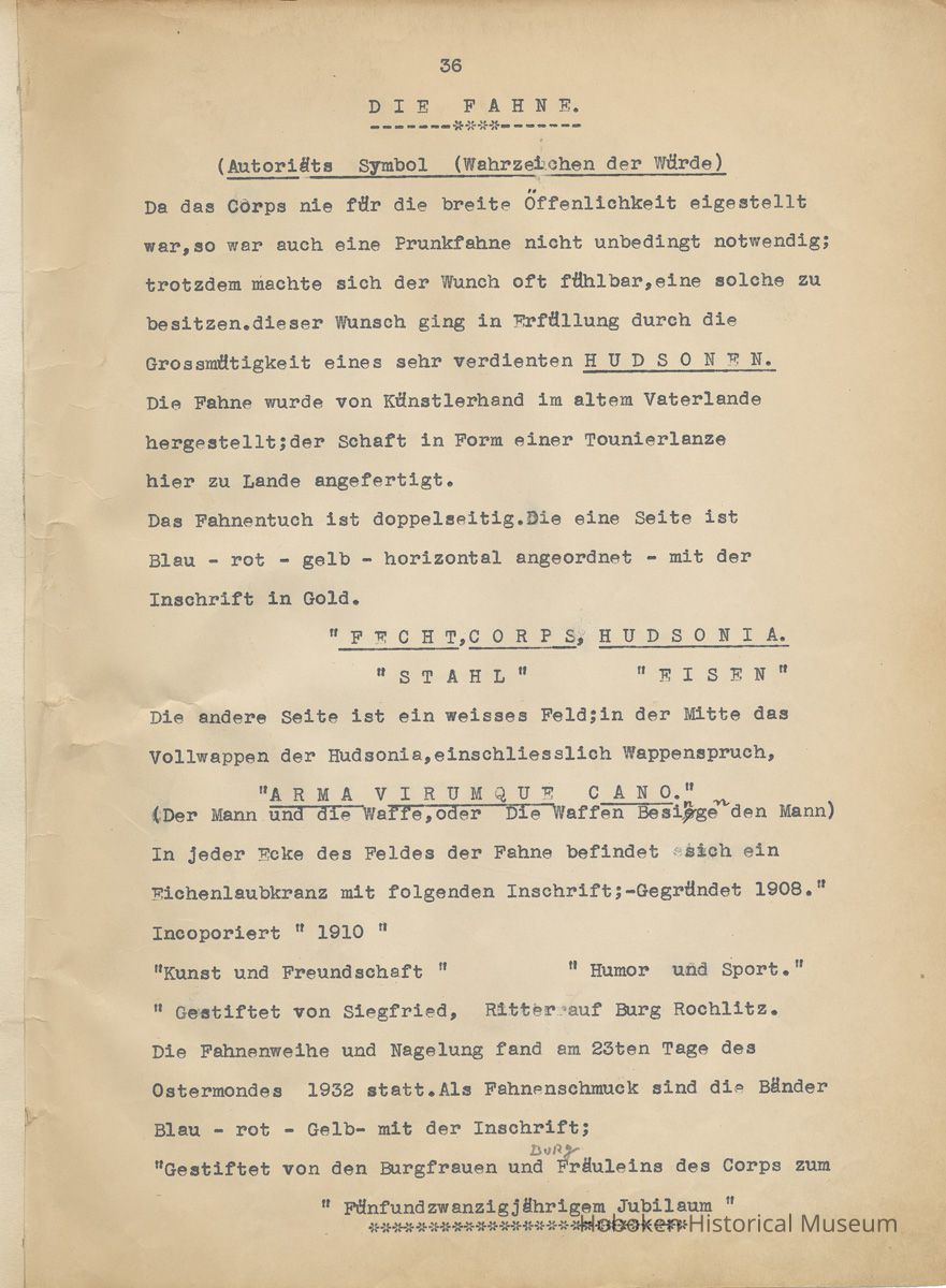 History of the Hudsonia Club 1908-1958; 506 Court St., Hoboken, 1958. 67 typewritten leaves, two-hole punched and reinforced; with a two ring canvas covered binder with hand titled and decorated front board. In German, untranslated, with holographic corrections, annotations and deletions. PDF on file.