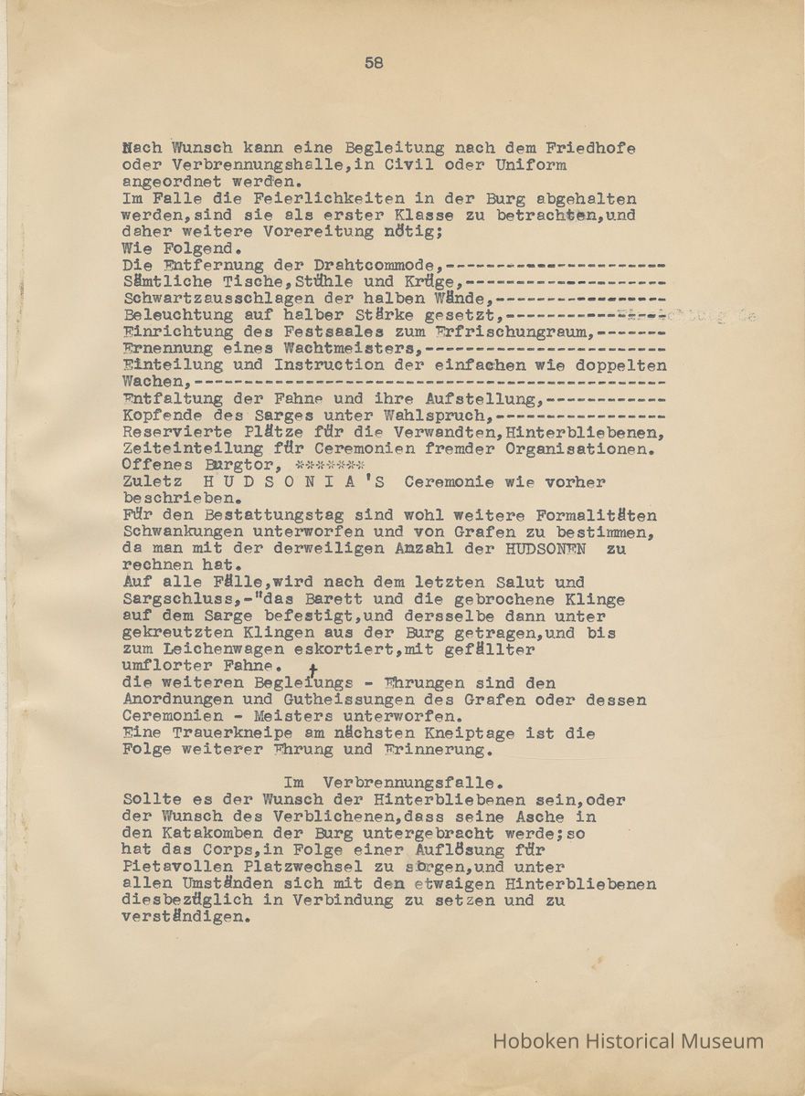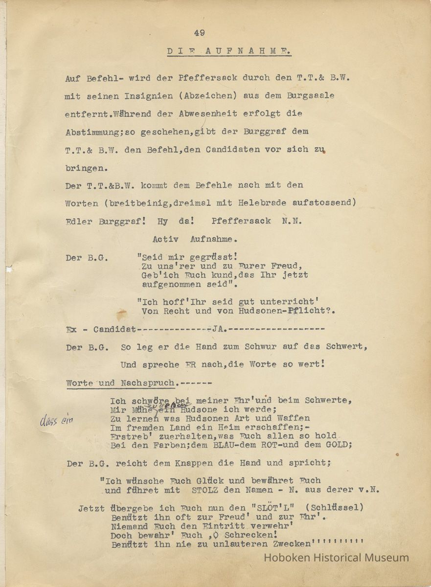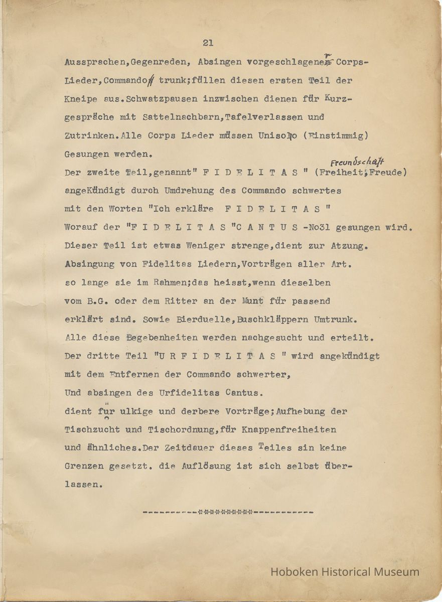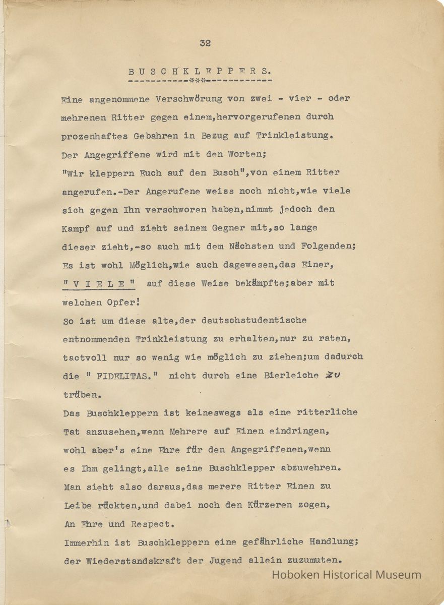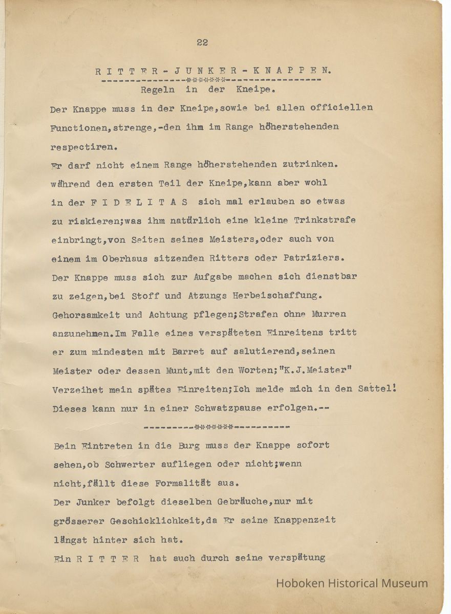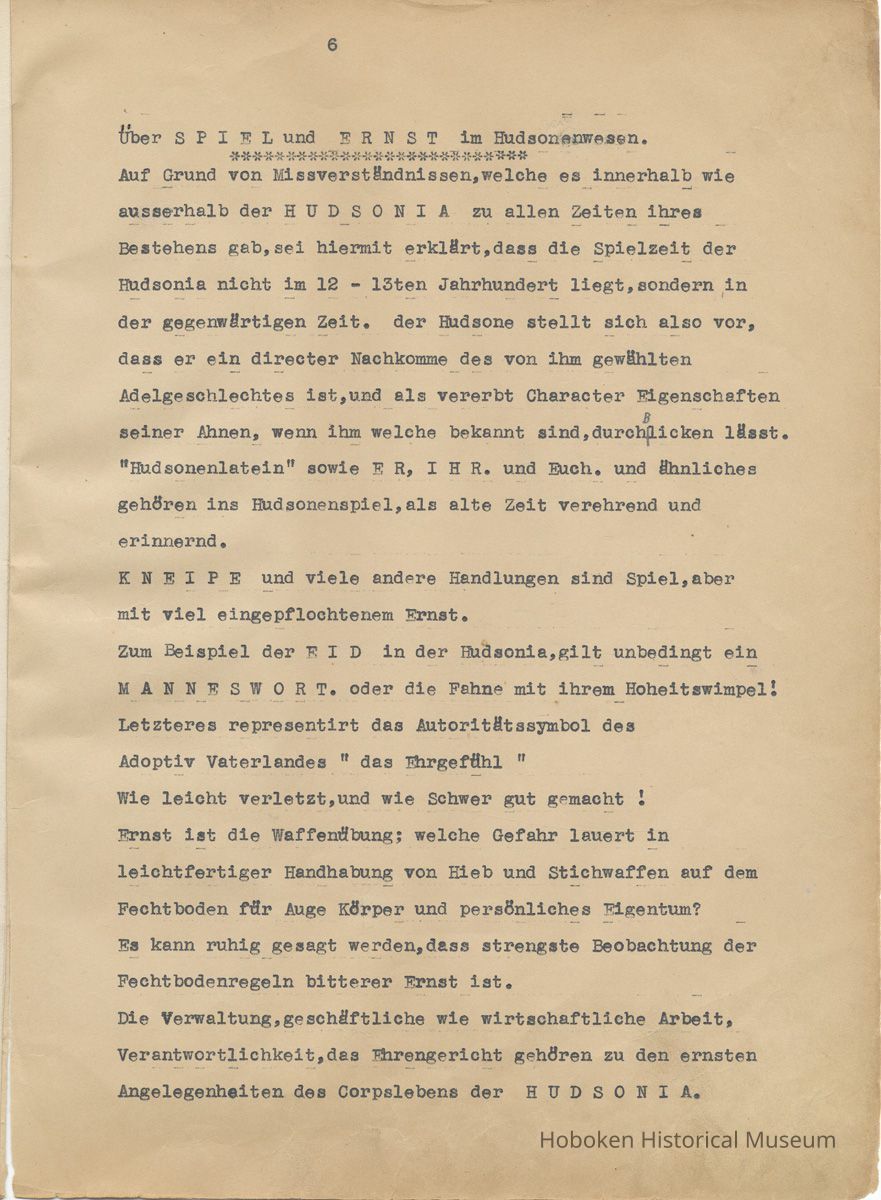 History of the Hudsonia Club 1908-1958; 506 Court St., Hoboken, 1958. 67 typewritten leaves, two-hole punched and reinforced; with a two ring canvas covered binder with hand titled and decorated front board. In German, untranslated, with holographic corrections, annotations and deletions. PDF on file.