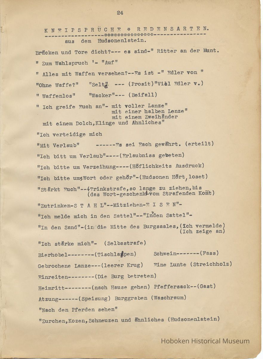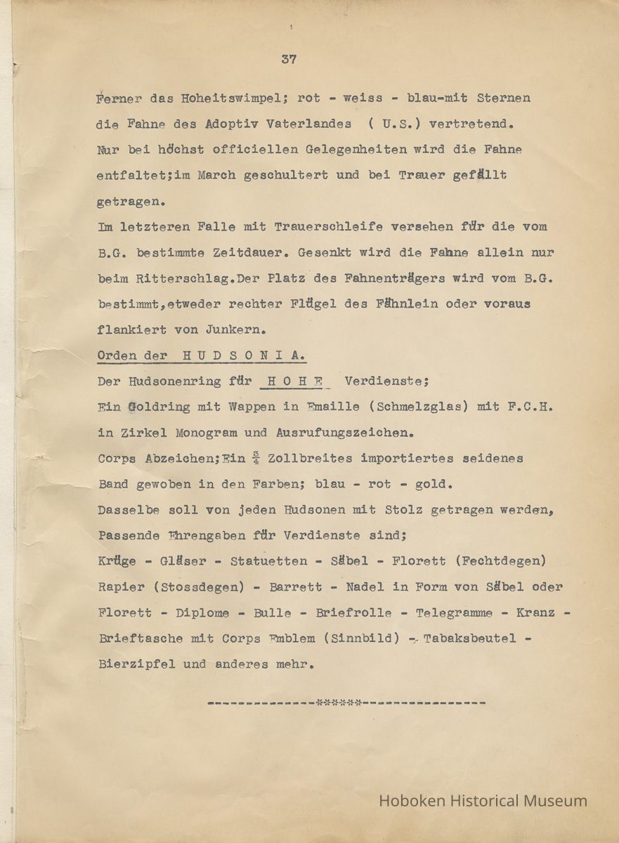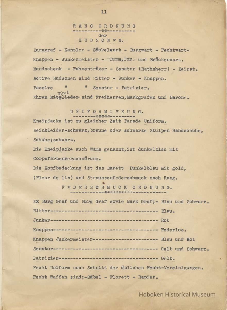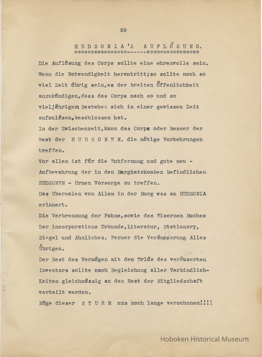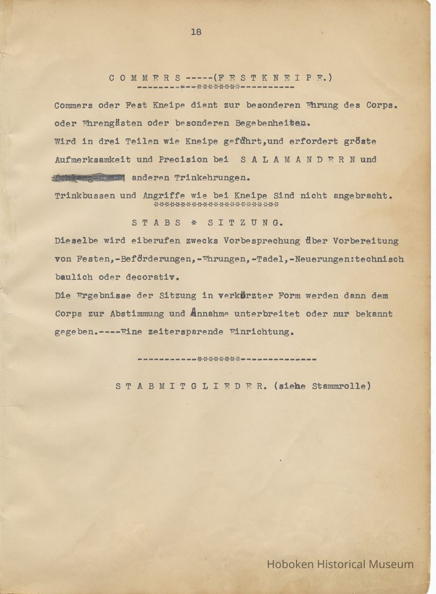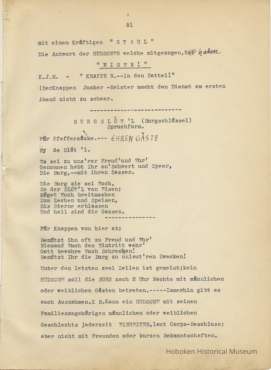 History of the Hudsonia Club 1908-1958; 506 Court St., Hoboken, 1958. 67 typewritten leaves, two-hole punched and reinforced; with a two ring canvas covered binder with hand titled and decorated front board. In German, untranslated, with holographic corrections, annotations and deletions. PDF on file.