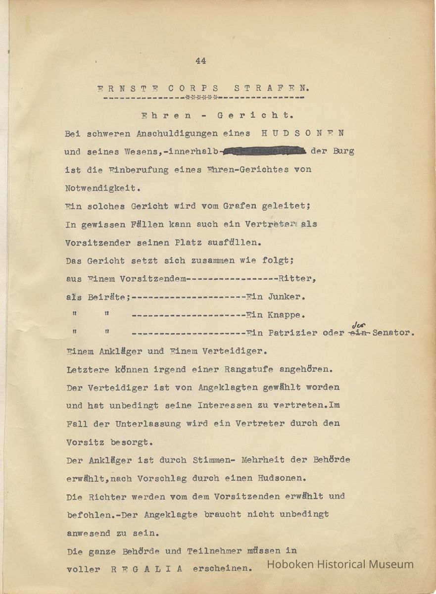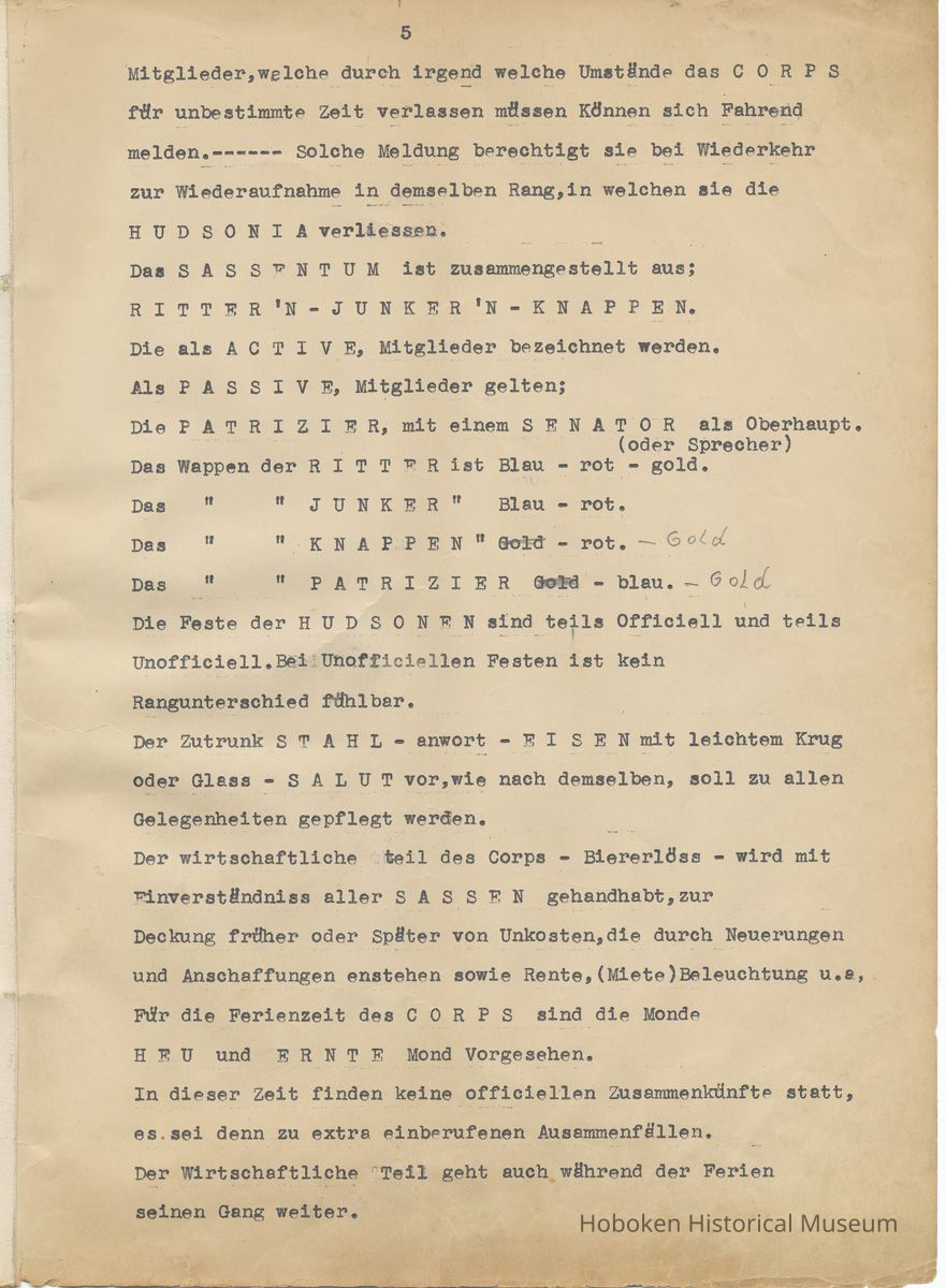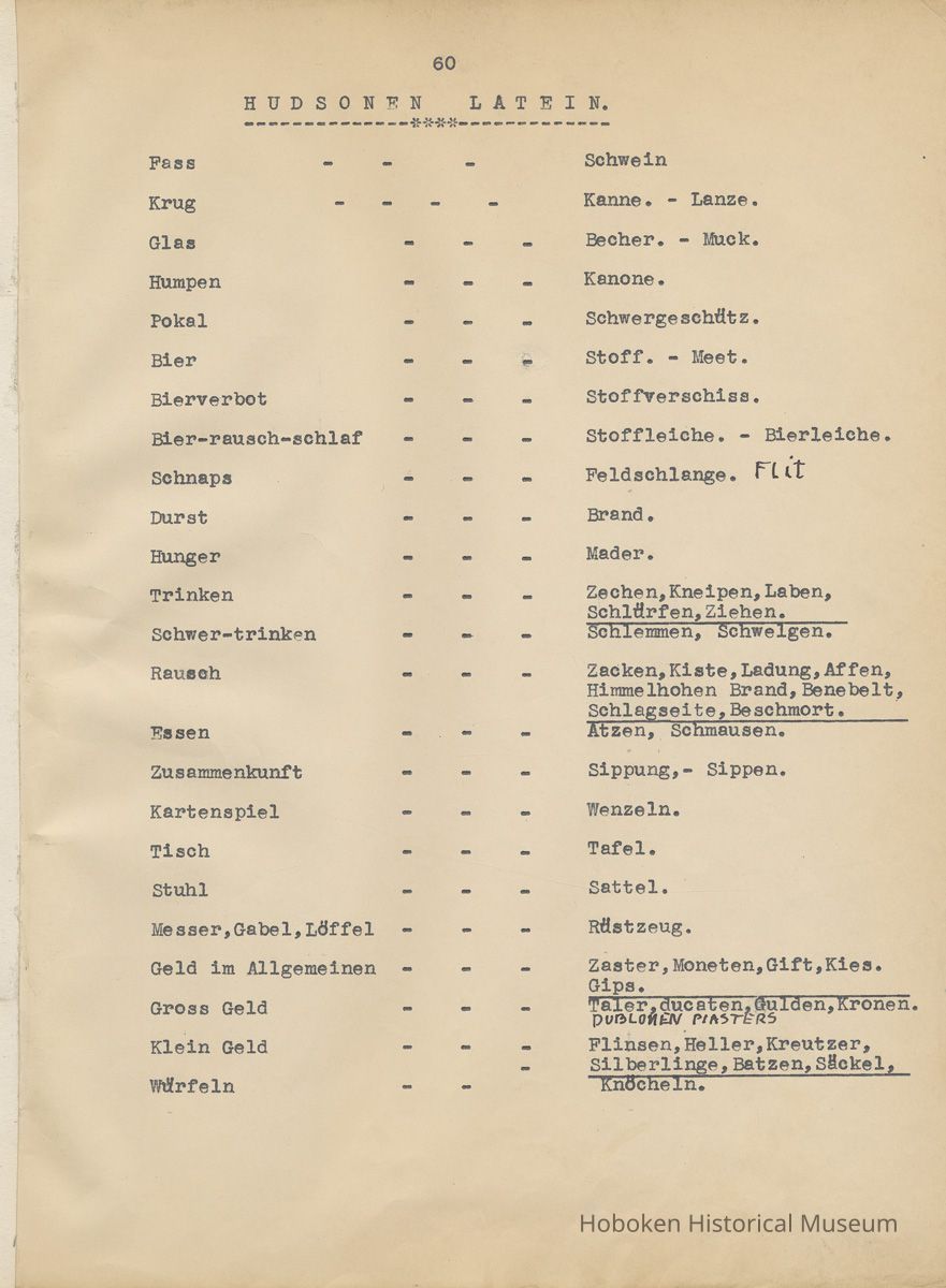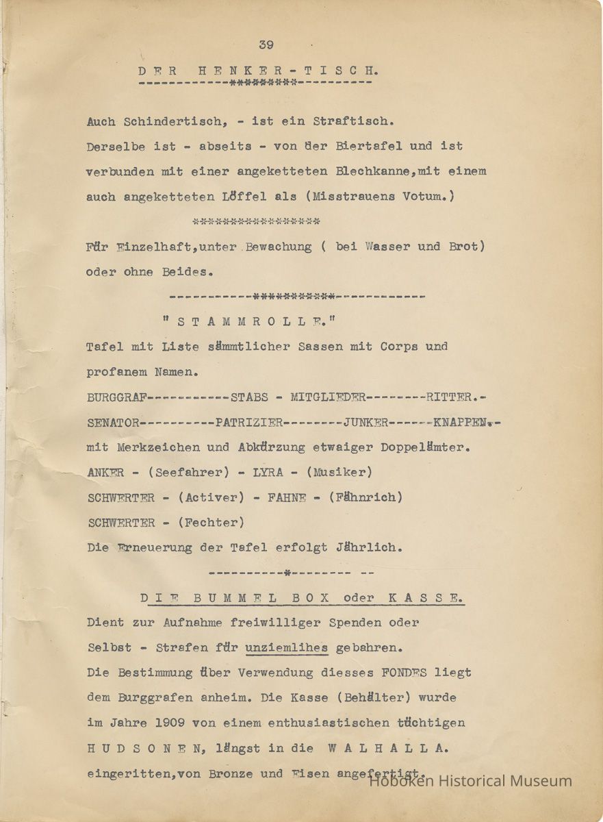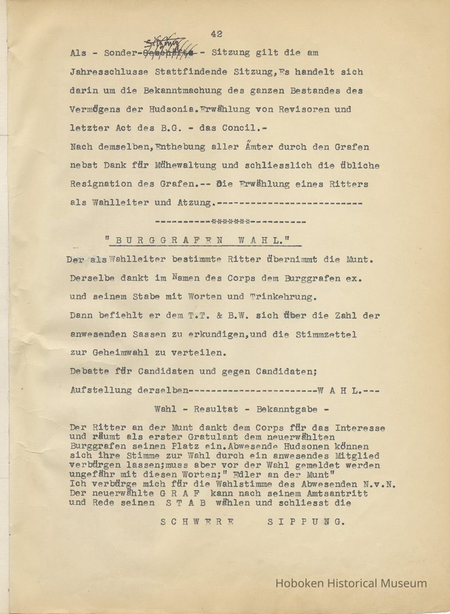History of the Hudsonia Club 1908-1958; 506 Court St., Hoboken, 1958. 67 typewritten leaves, two-hole punched and reinforced; with a two ring canvas covered binder with hand titled and decorated front board. In German, untranslated, with holographic corrections, annotations and deletions. PDF on file.