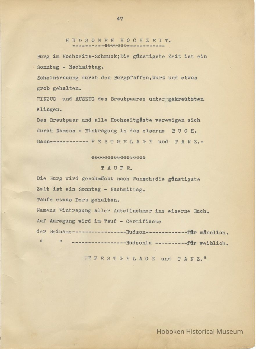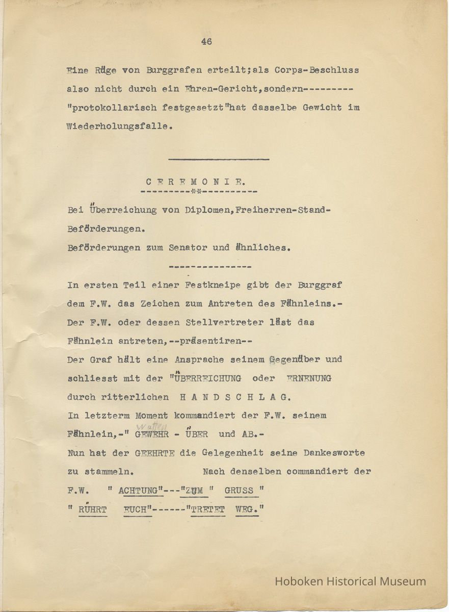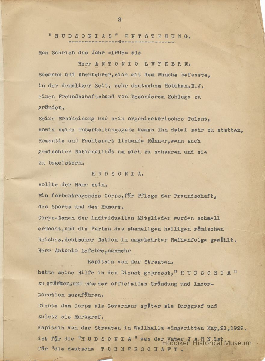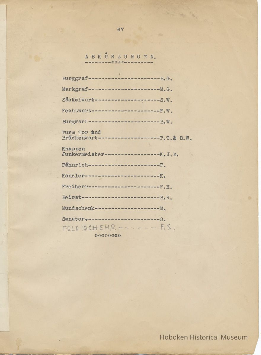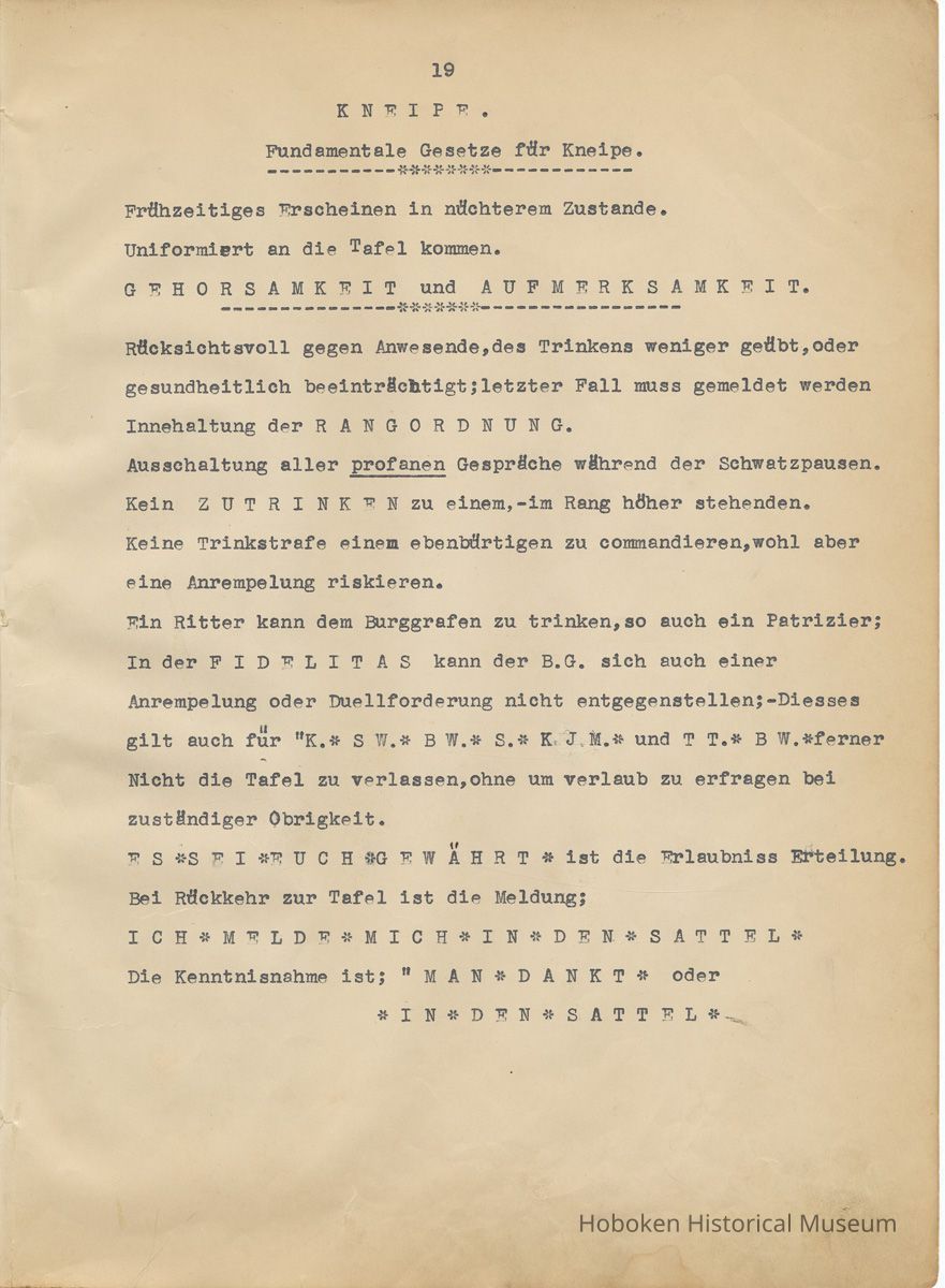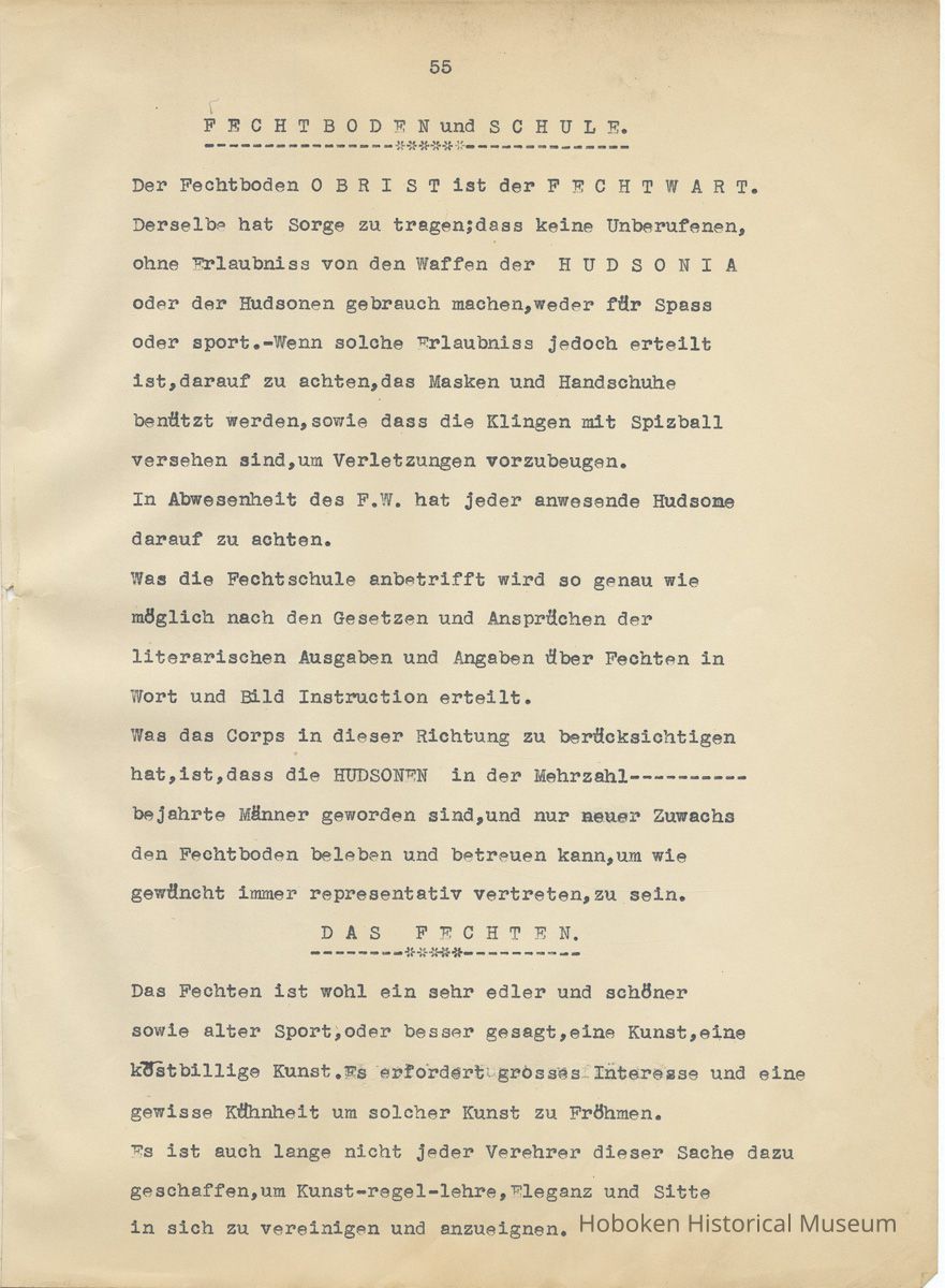 History of the Hudsonia Club 1908-1958; 506 Court St., Hoboken, 1958. 67 typewritten leaves, two-hole punched and reinforced; with a two ring canvas covered binder with hand titled and decorated front board. In German, untranslated, with holographic corrections, annotations and deletions. PDF on file.