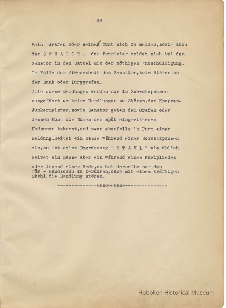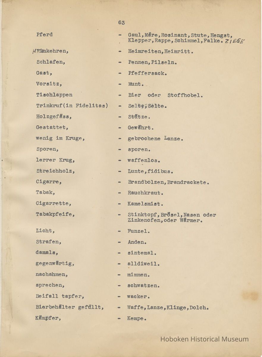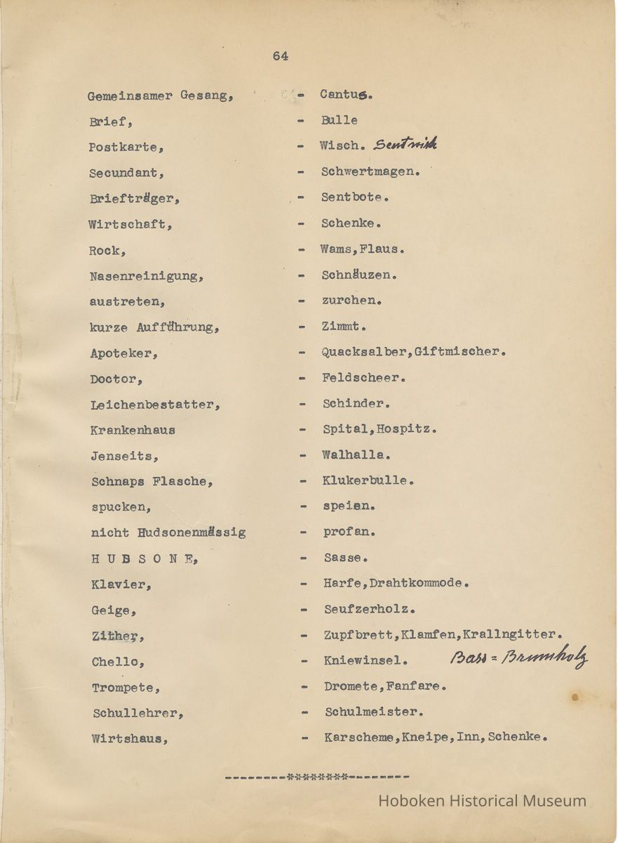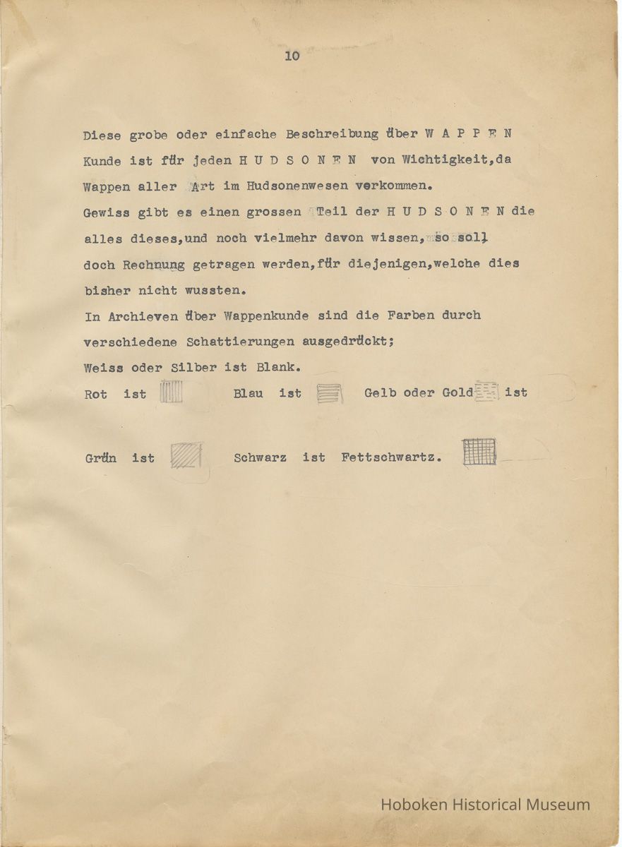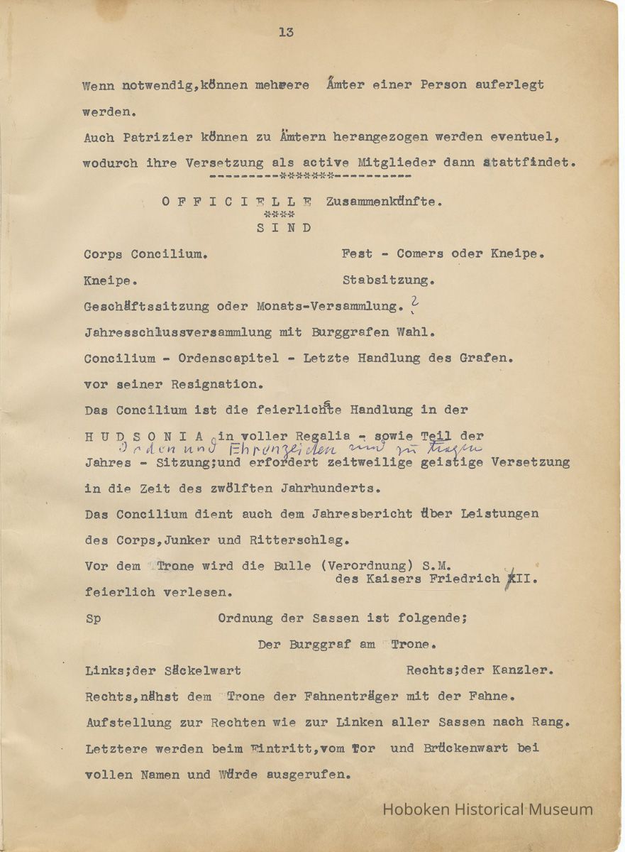 History of the Hudsonia Club 1908-1958; 506 Court St., Hoboken, 1958. 67 typewritten leaves, two-hole punched and reinforced; with a two ring canvas covered binder with hand titled and decorated front board. In German, untranslated, with holographic corrections, annotations and deletions. PDF on file.