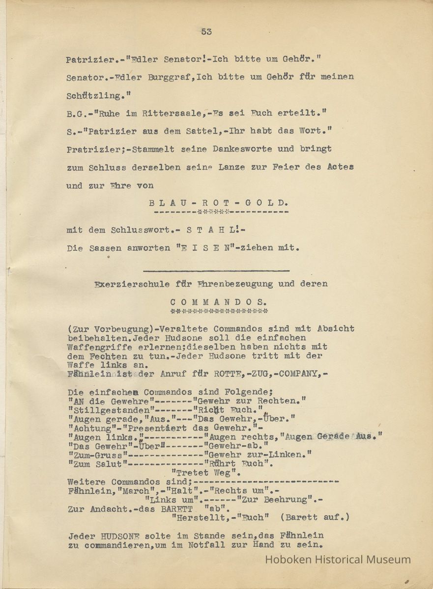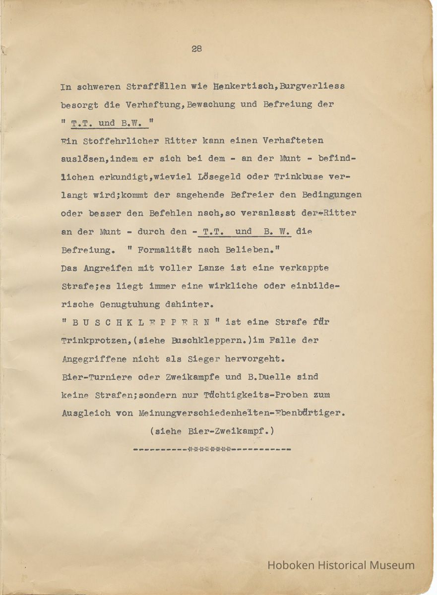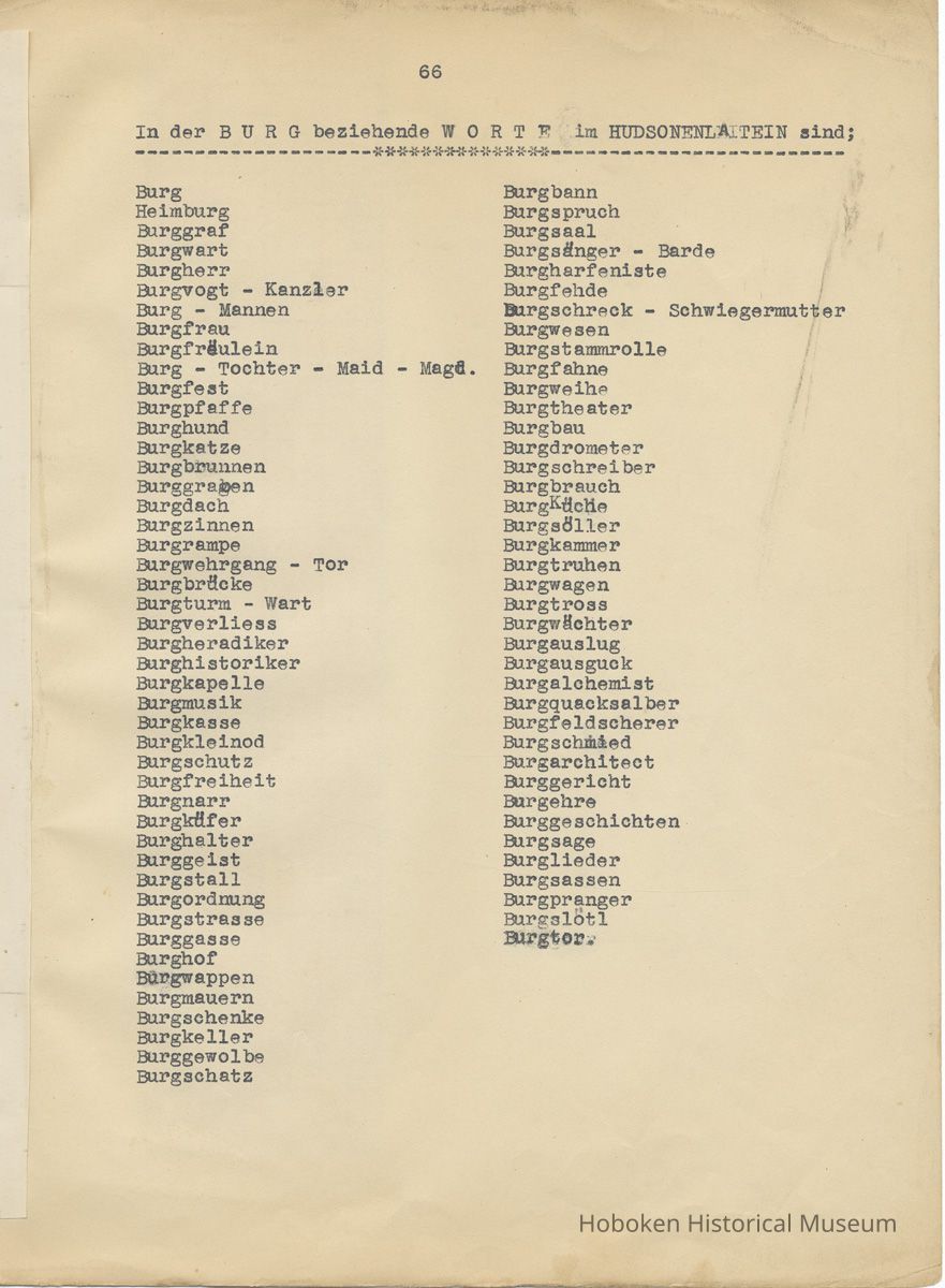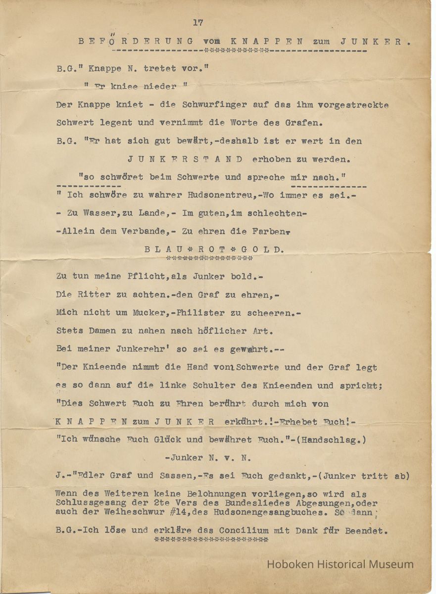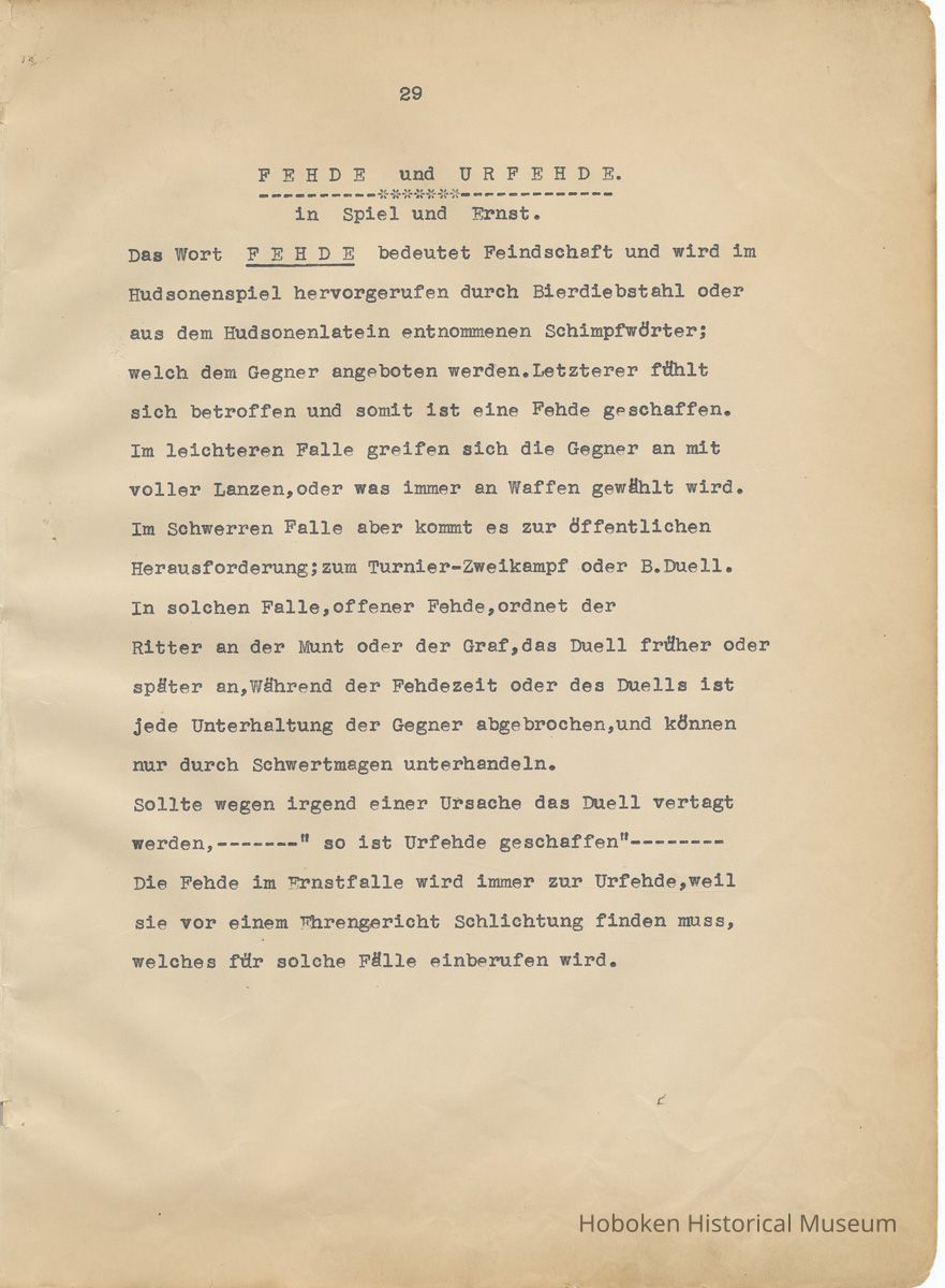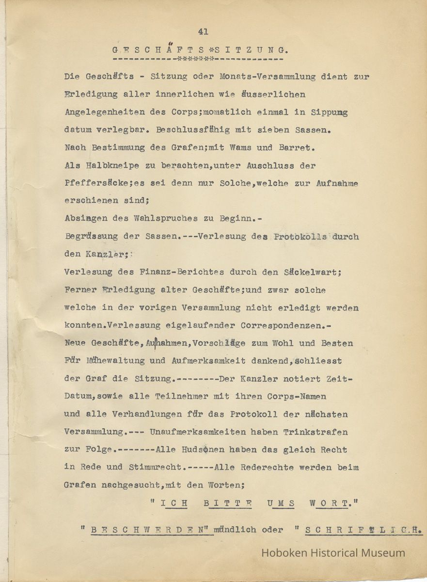 History of the Hudsonia Club 1908-1958; 506 Court St., Hoboken, 1958. 67 typewritten leaves, two-hole punched and reinforced; with a two ring canvas covered binder with hand titled and decorated front board. In German, untranslated, with holographic corrections, annotations and deletions. PDF on file.