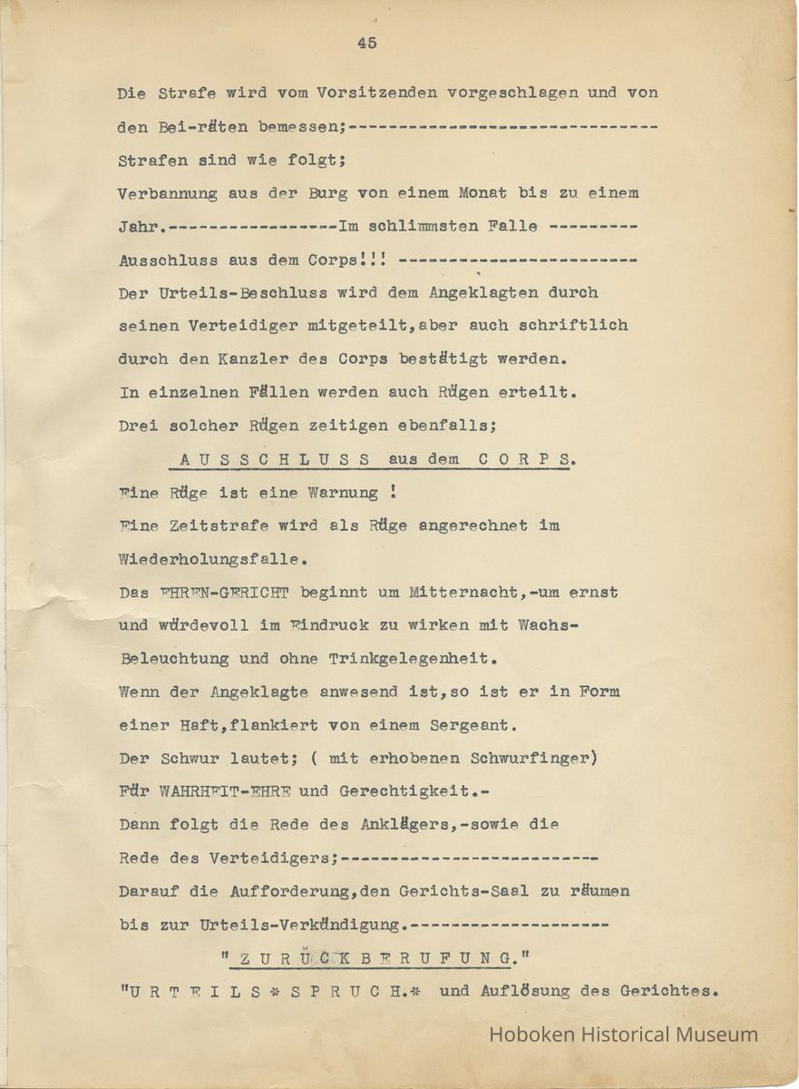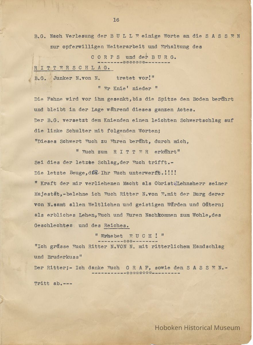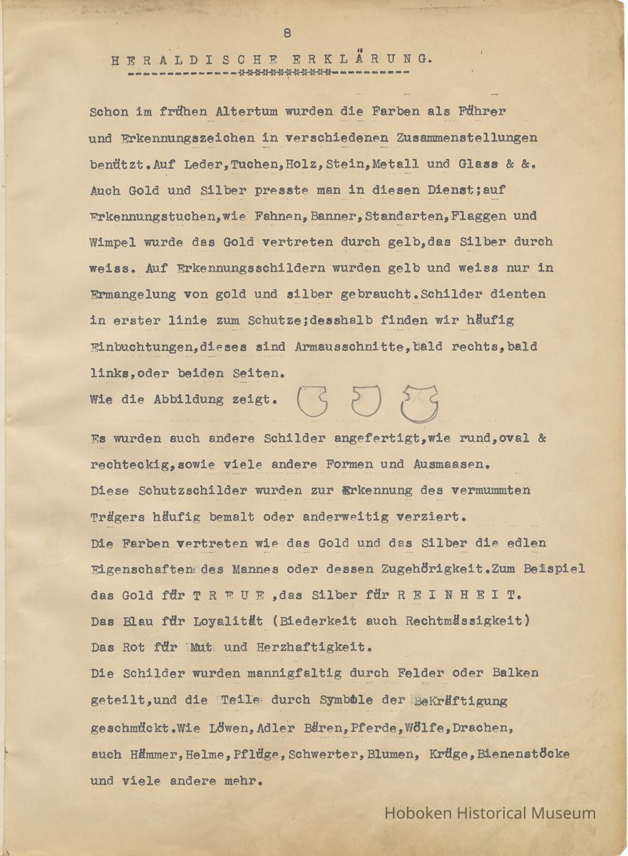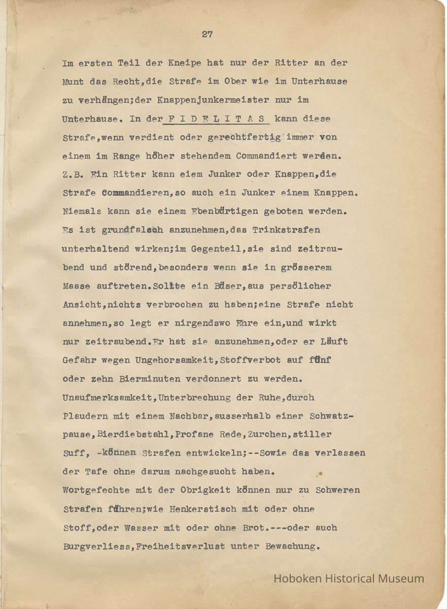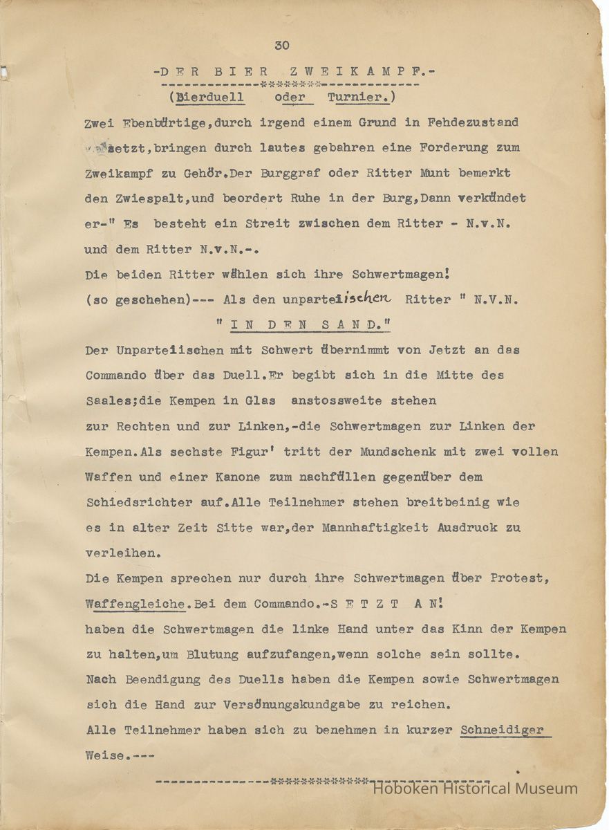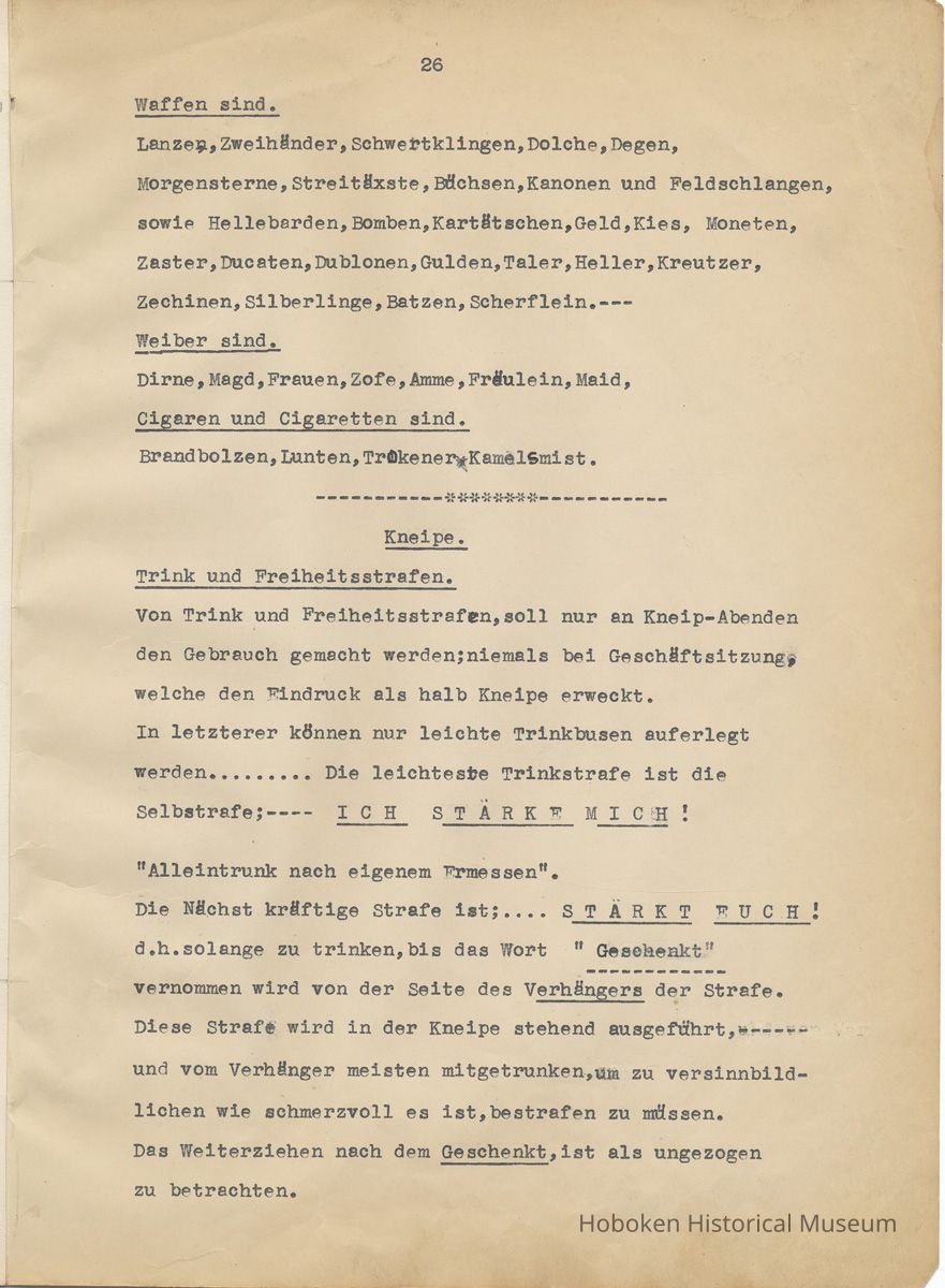 History of the Hudsonia Club 1908-1958; 506 Court St., Hoboken, 1958. 67 typewritten leaves, two-hole punched and reinforced; with a two ring canvas covered binder with hand titled and decorated front board. In German, untranslated, with holographic corrections, annotations and deletions. PDF on file.