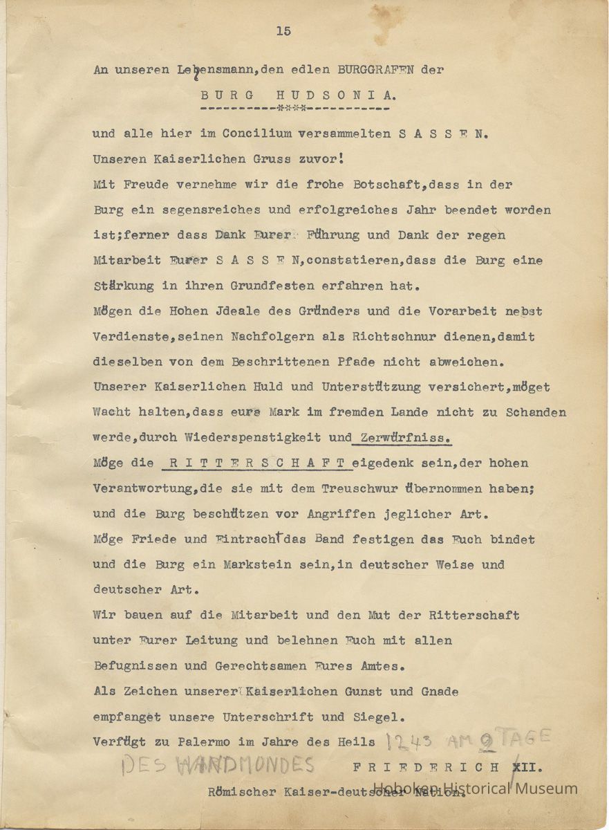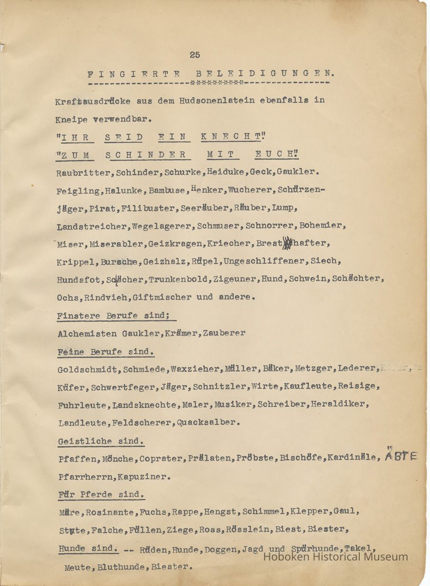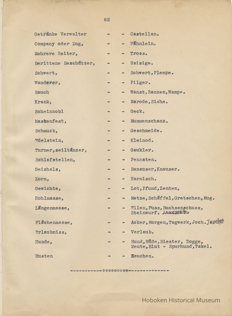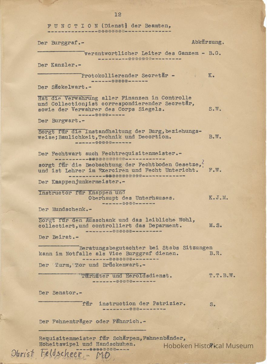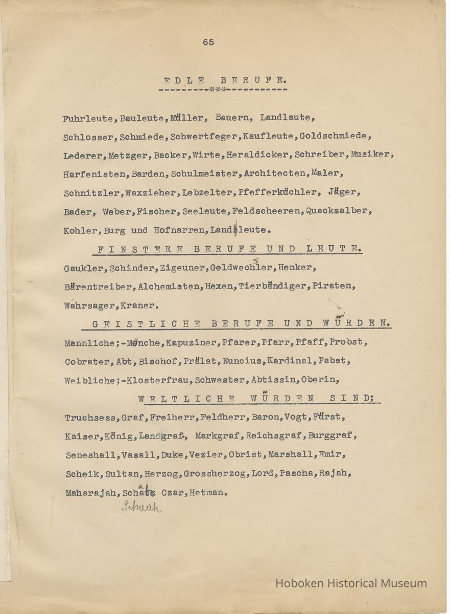 History of the Hudsonia Club 1908-1958; 506 Court St., Hoboken, 1958. 67 typewritten leaves, two-hole punched and reinforced; with a two ring canvas covered binder with hand titled and decorated front board. In German, untranslated, with holographic corrections, annotations and deletions. PDF on file.