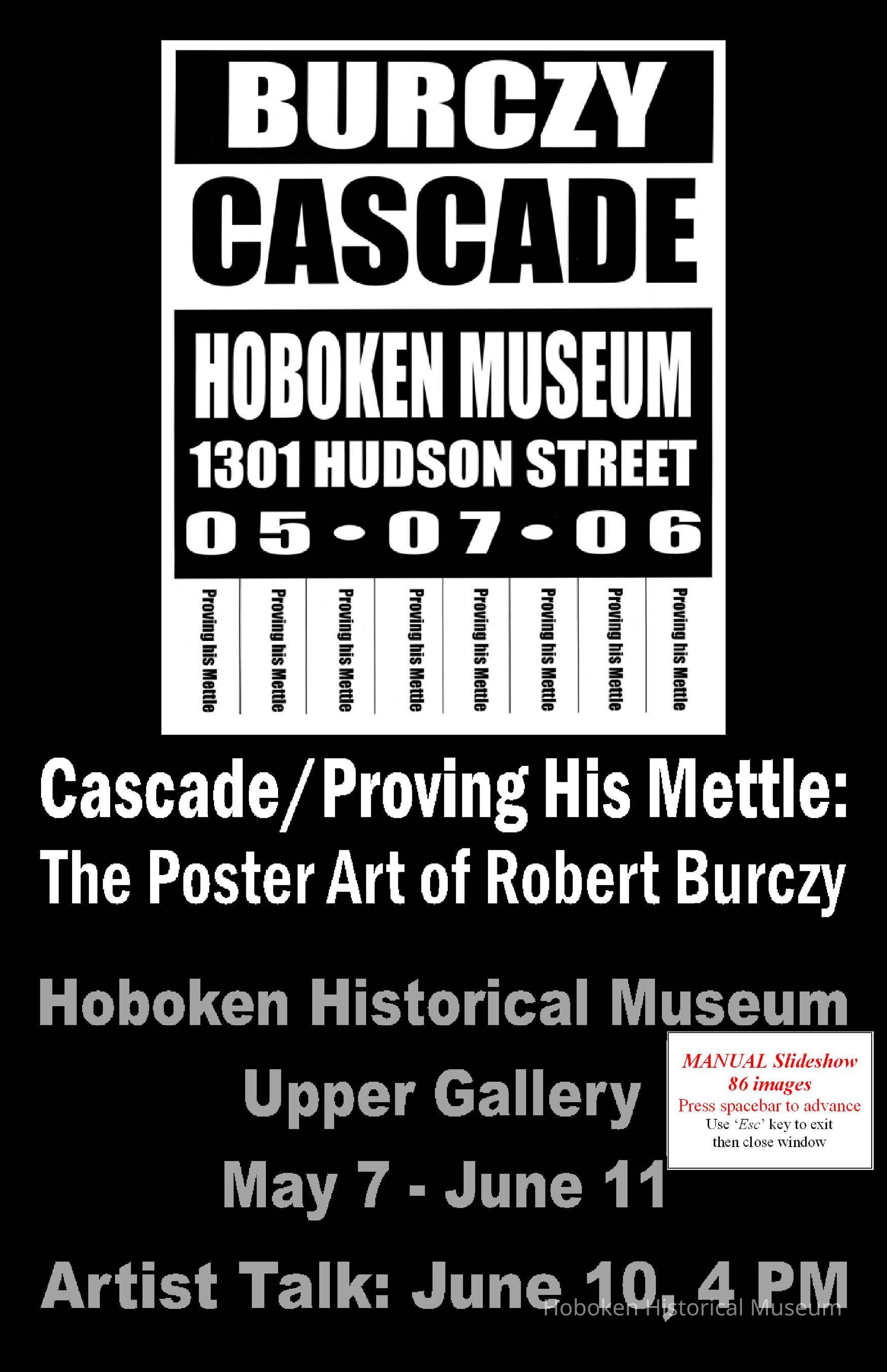 PDF slideshow of contents of exhibition, Cascade/Proving His Mettle: The Poster Art of Robert Burczy, in the Upper Gallery, Hoboken Historical Museum, May 7 to July 1, 2006 (was scheduled to end June 11, but it was extended.)