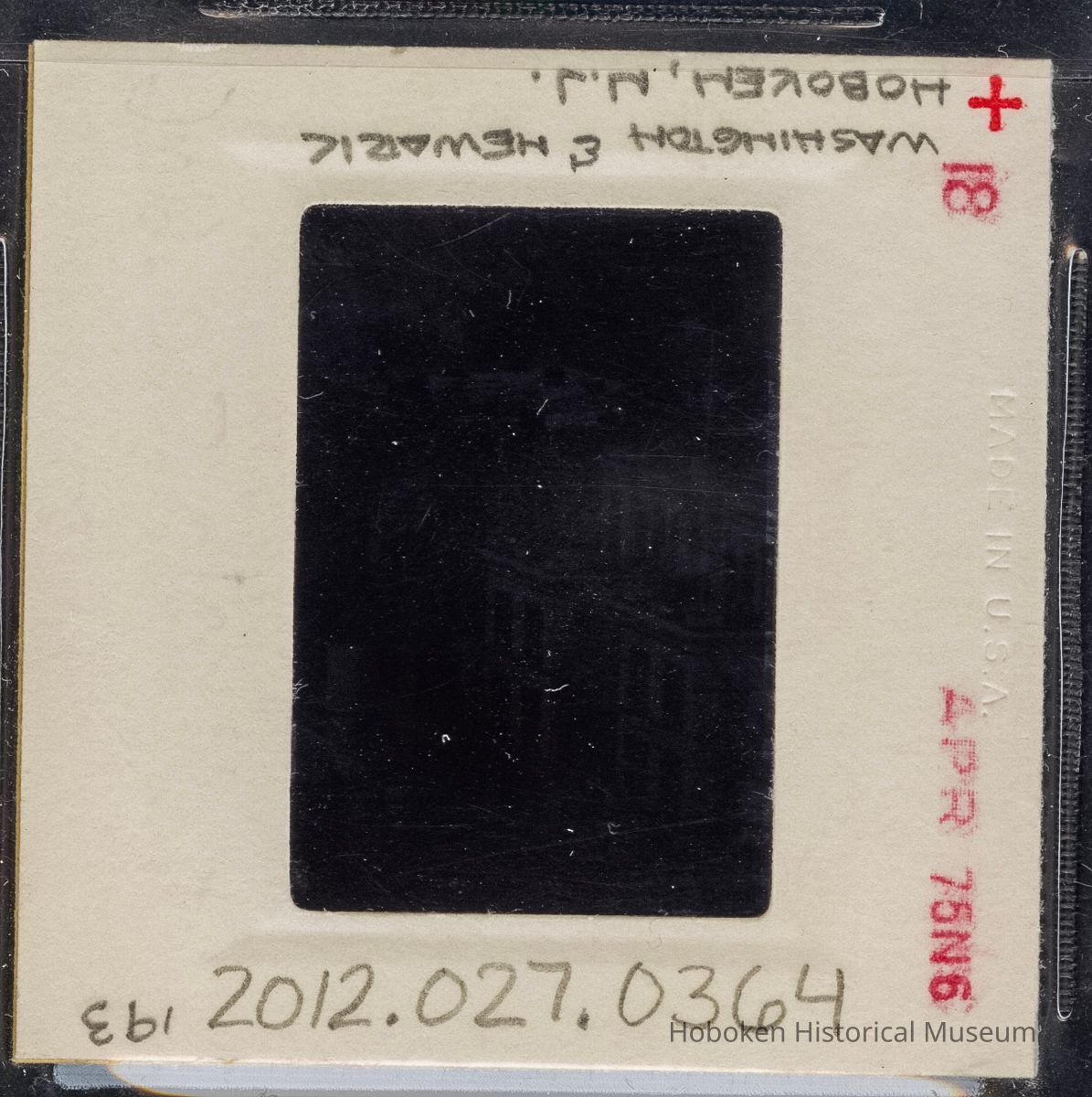 Color slide of aerial view from Washington and Newark looking SW at the Hoboken City Hall façade.