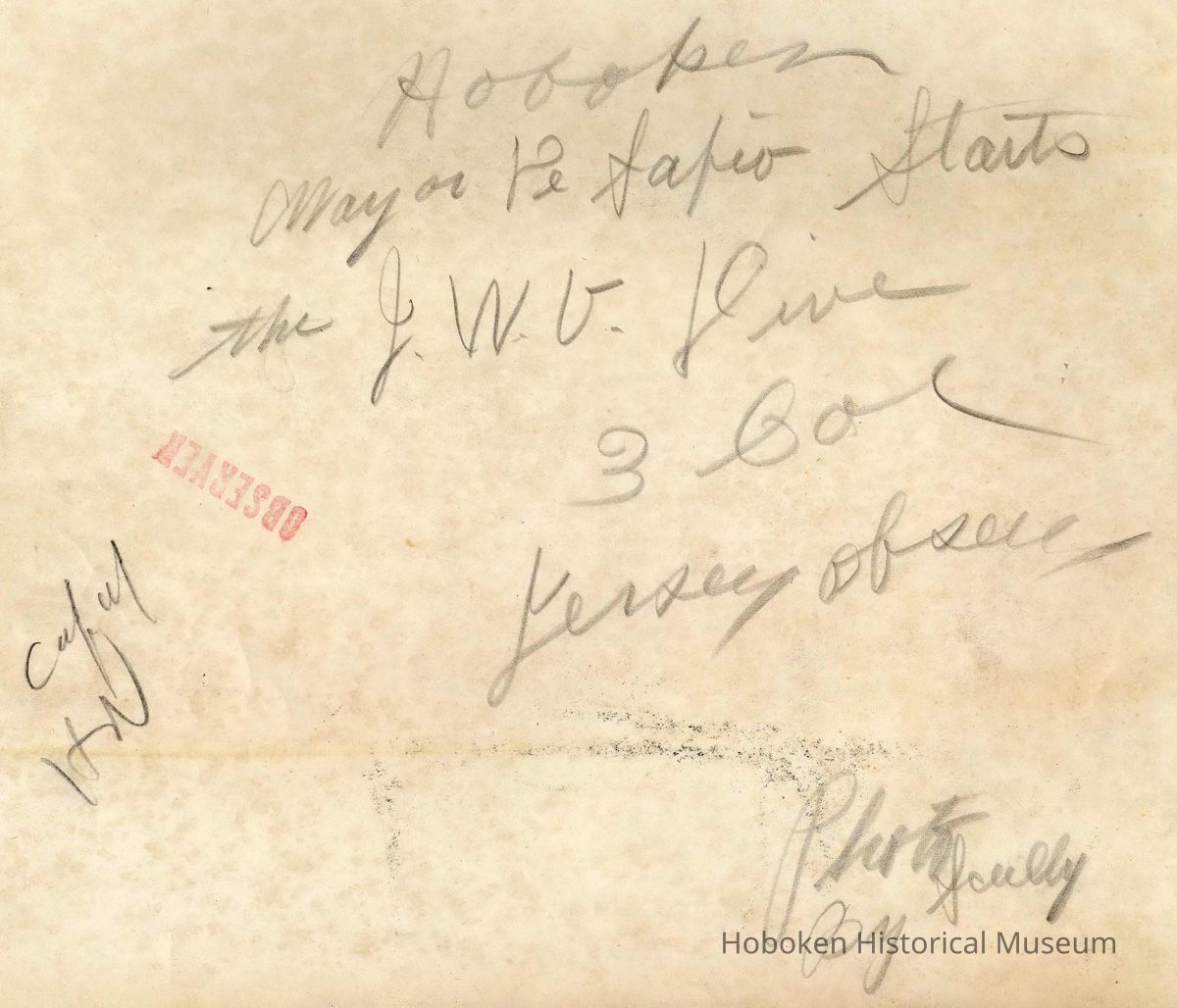 Reverse red-ink stamp "Observer" indicating this was a print for the newspaper Jersey Observer (ceased publication 1951) plus pencil text probably for the caption: Hoboken | Mayor DeSapio starts | the J.W.V. Drive | 3 Col | Jersey Observer | Photo | by Scully.