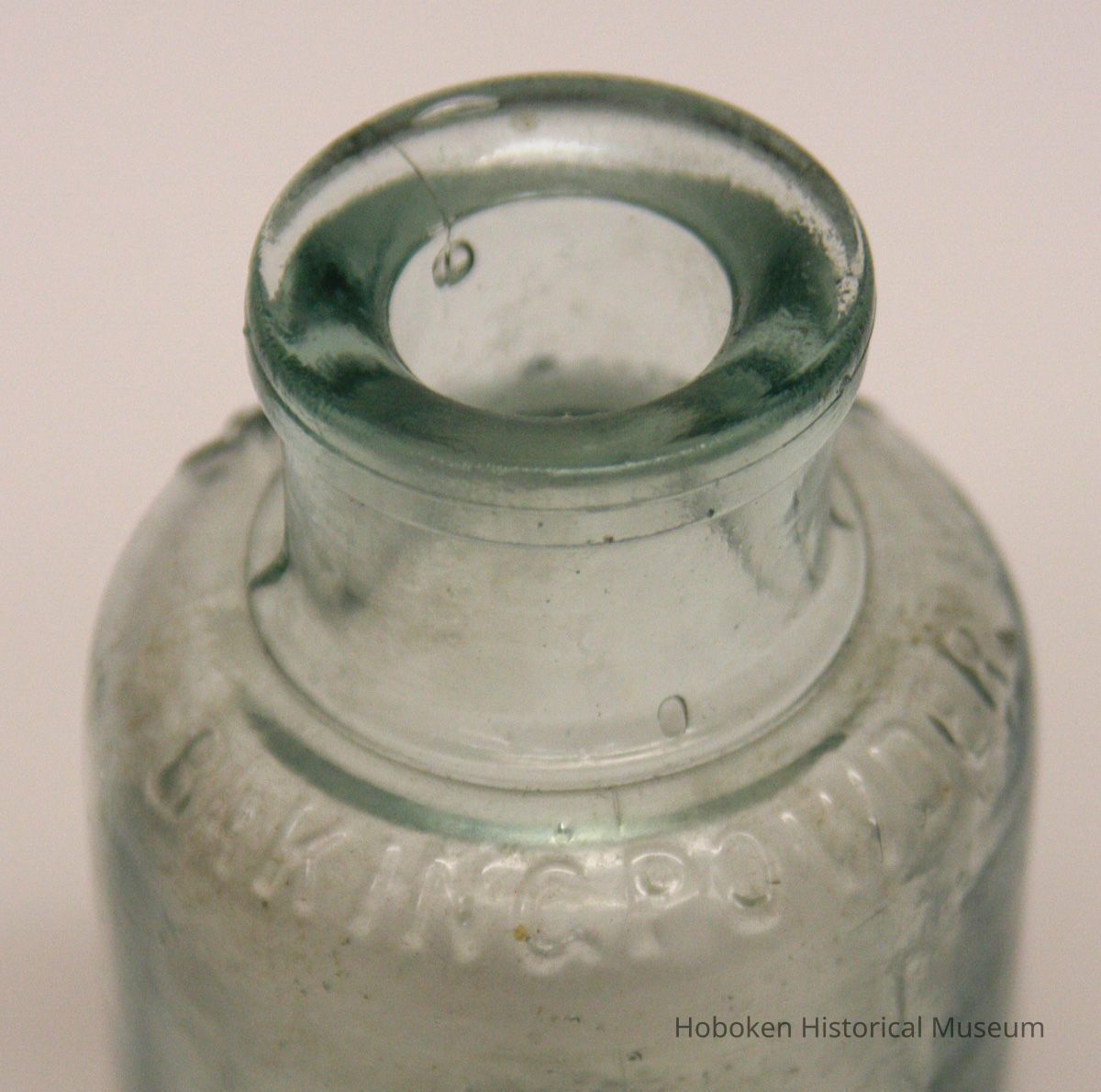 Davis OK Baking Powder. Product made by R. B. Davis Co., Hoboken, no date, circa 1890-1910. Greenish tint clear molded glass, 2-1/4" diameter x 4-3/8" high; 3/4" diameter bore; embossed lettering on shoulder; flanged lip, wide rim; mold seams slightly raised. No maker's marks on base.