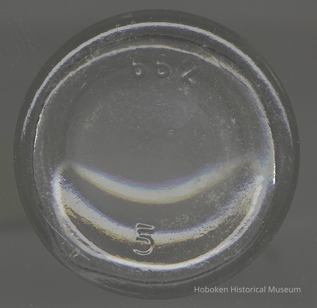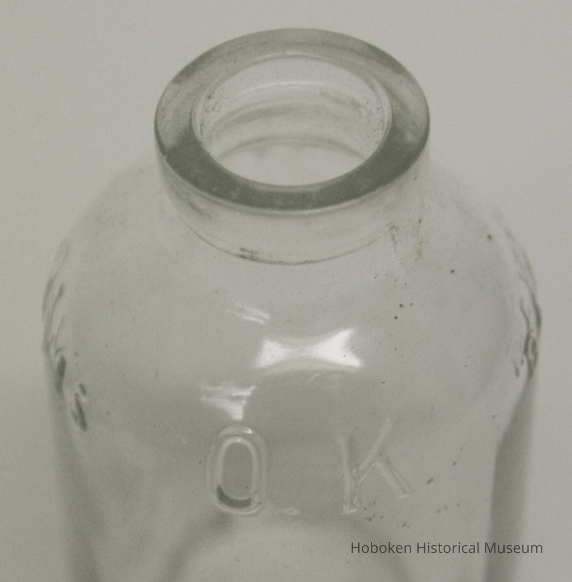 Davis OK Baking Powder. Product made by R. B. Davis Co., Hoboken, no date, circa 1900-1910. Clear molded glass, 2-1/4" diameter x 4-1/4" high; 3/4" diameter bore; embossed lettering on shoulder; flanged lip, wide rim; flat top unground; some bubbles in glass. Mold seams prominent. Maker's marks on base: 662 ; 5.