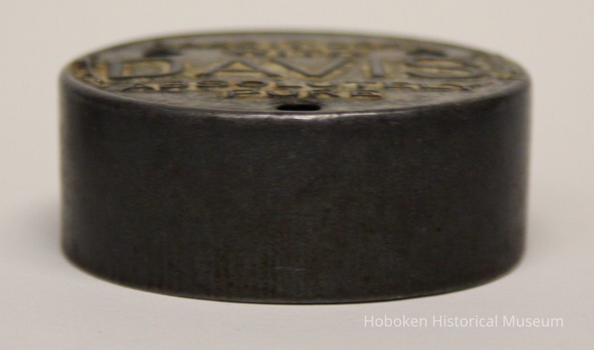 A promotional item. Davis made its main product, Baking Powder in Hoboken during the time period this item was issued. They had can making facilities as part of manufacturing and packaging operations at least in the 1920s, but can lids stamped in this same lettering format are known to have been used by them.