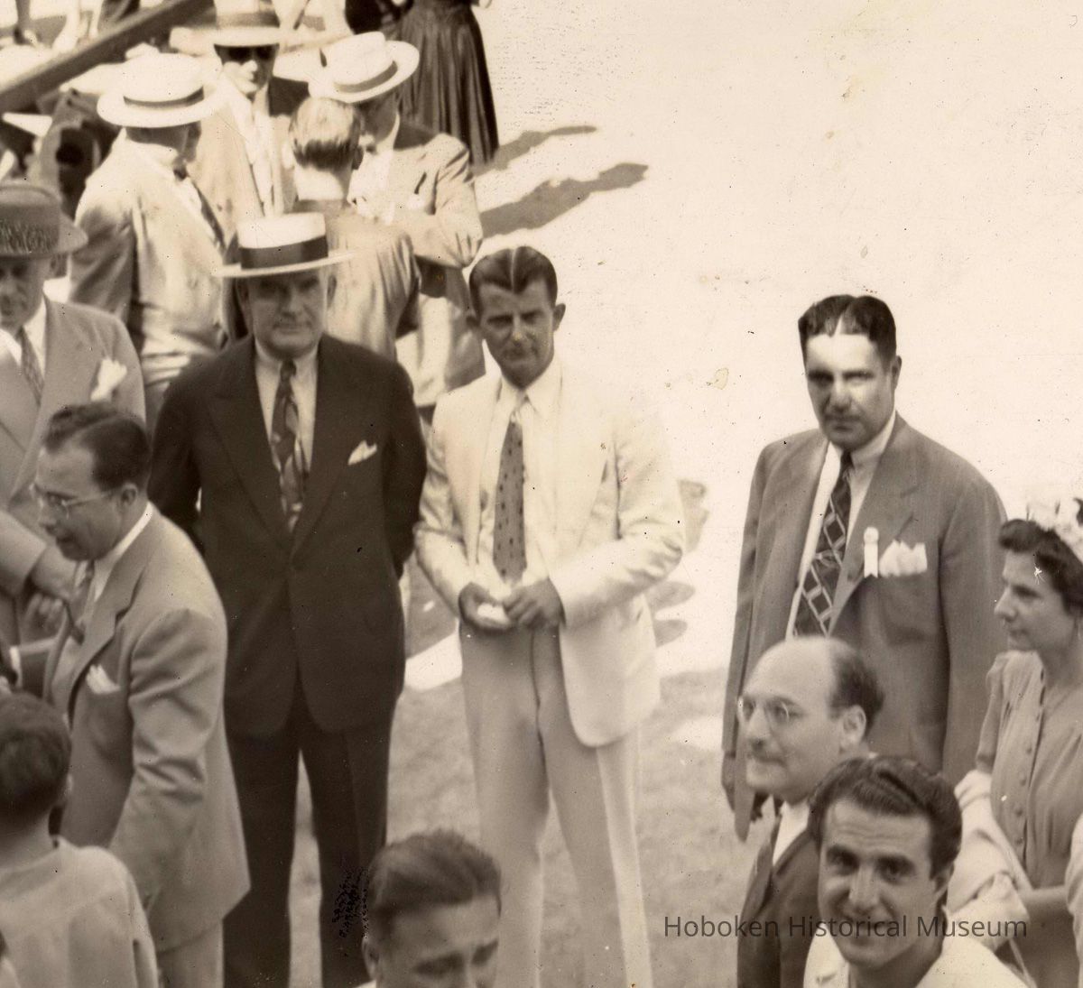 Digital image of sepia-tone photo of Bernard McFeely, Fred DeSapio, Dominick Policastro and townspeople waiting to board a dayliner for DeSapio Democratic Association outing, Hoboken, no date, ca. 1945-1947. Original print 8" x 10" wide. Photographer not indicated.