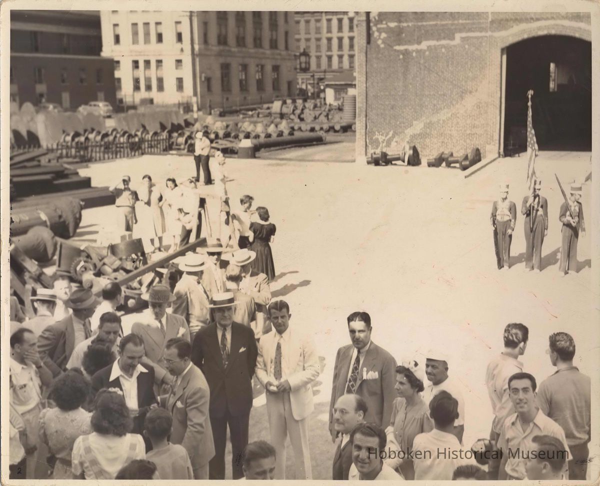 The view is looking southwest. In the background at the right, behind the marching color guard, is the headhouse for Pier 1. Note the crankshafts sitting outside the doorway. The building at the left is side of the Main Post Office and second building from the left is the Steneck building, 95 River St.
