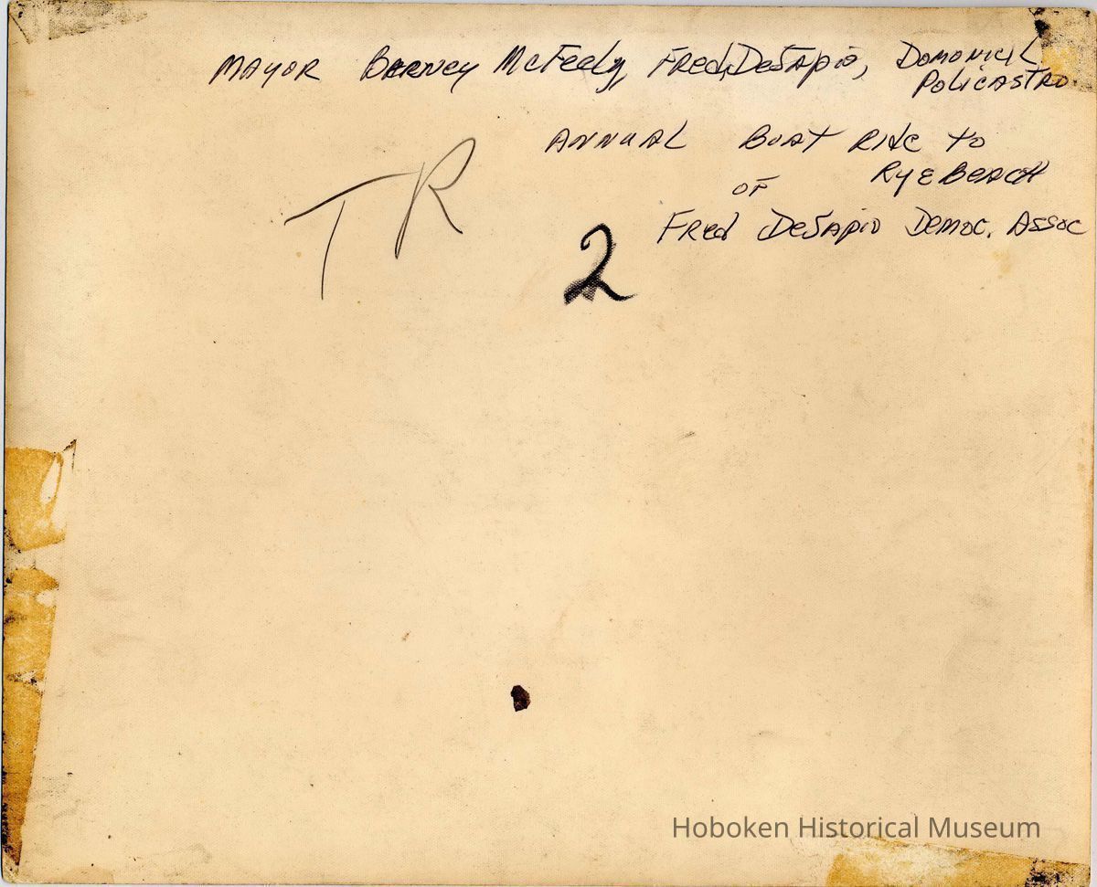 Original image from the papers of Fred M. DeSapio. Front has numeral '2' in black ink on print at bottom left corner. Reverse has pencil letters "TR" [indicating 'top right' for position, either in multiple matte for framing - suggested by tape marks on reverse, but no matte burn is evident - or in some un-named publication] and lower on the sheet the numeral '2' done with black grease pencil. Also on reverse, modern holographic ink notation by Dr. Gerard DeSapio: Mayor Bernard McFeely, Fred DeSapio, Domonick (sic) Policastro [Dr. DeSapio identifies him as "Sgt" in another photo from this outing] | Annual boat ride to Rye Beach of Fred DeSapio Democ. Assoc.