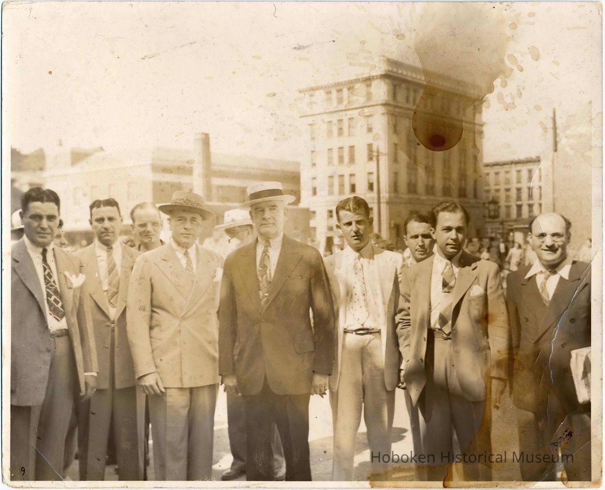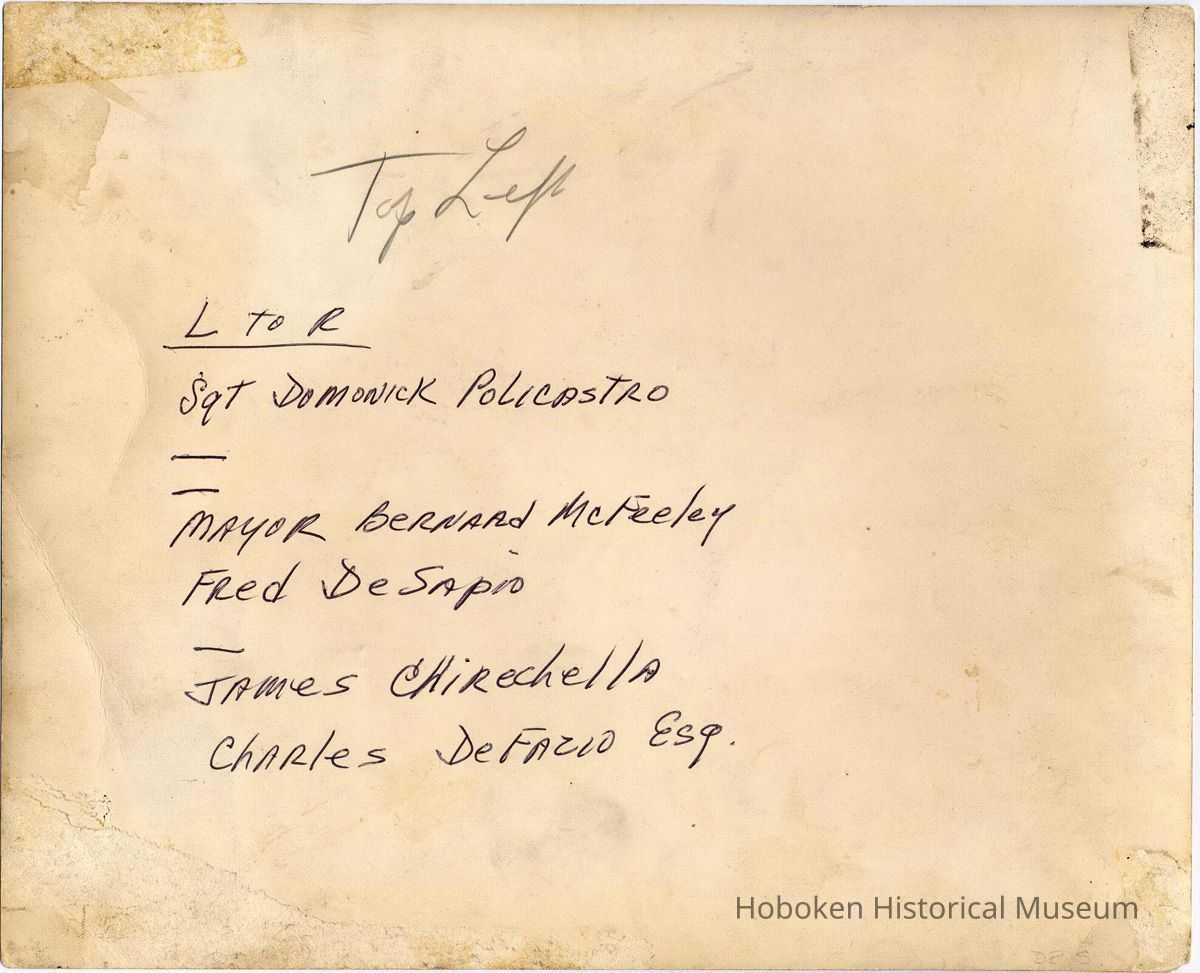 Original image from the papers of Fred M. DeSapio. Front has numeral '9' in black ink on print at bottom left corner. Reverse has pencil notation "Top Left" [indicating position either in multiple matte for framing - suggested by tape marks on reverse, but no matte burn is evident - or in some un-named publication]. Also on reverse, modern holographic ink identifications by Dr. Gerard DeSapio: L to R | Sgt Domonick (sic) Policastro | ______ | ______ | Mayor Bernard McFeely | Fred DeSapio | _____ | James Chirechella | Charles DeFazio Esq.