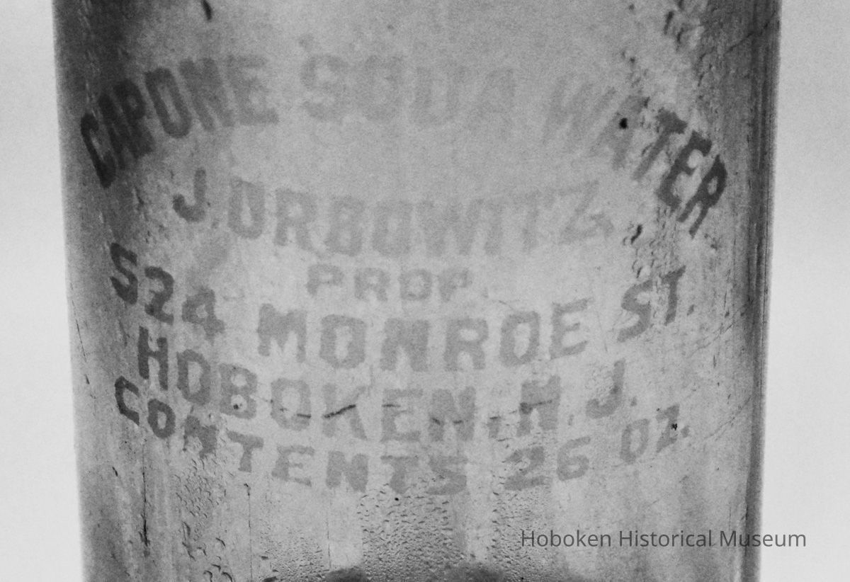 Seltzer bottle: Capone Soda Water, J. Urbowitz, Prop., 524 Monroe St., Hoboken, N.J., Contents 26 oz. No date, circa 1940s-1950s.