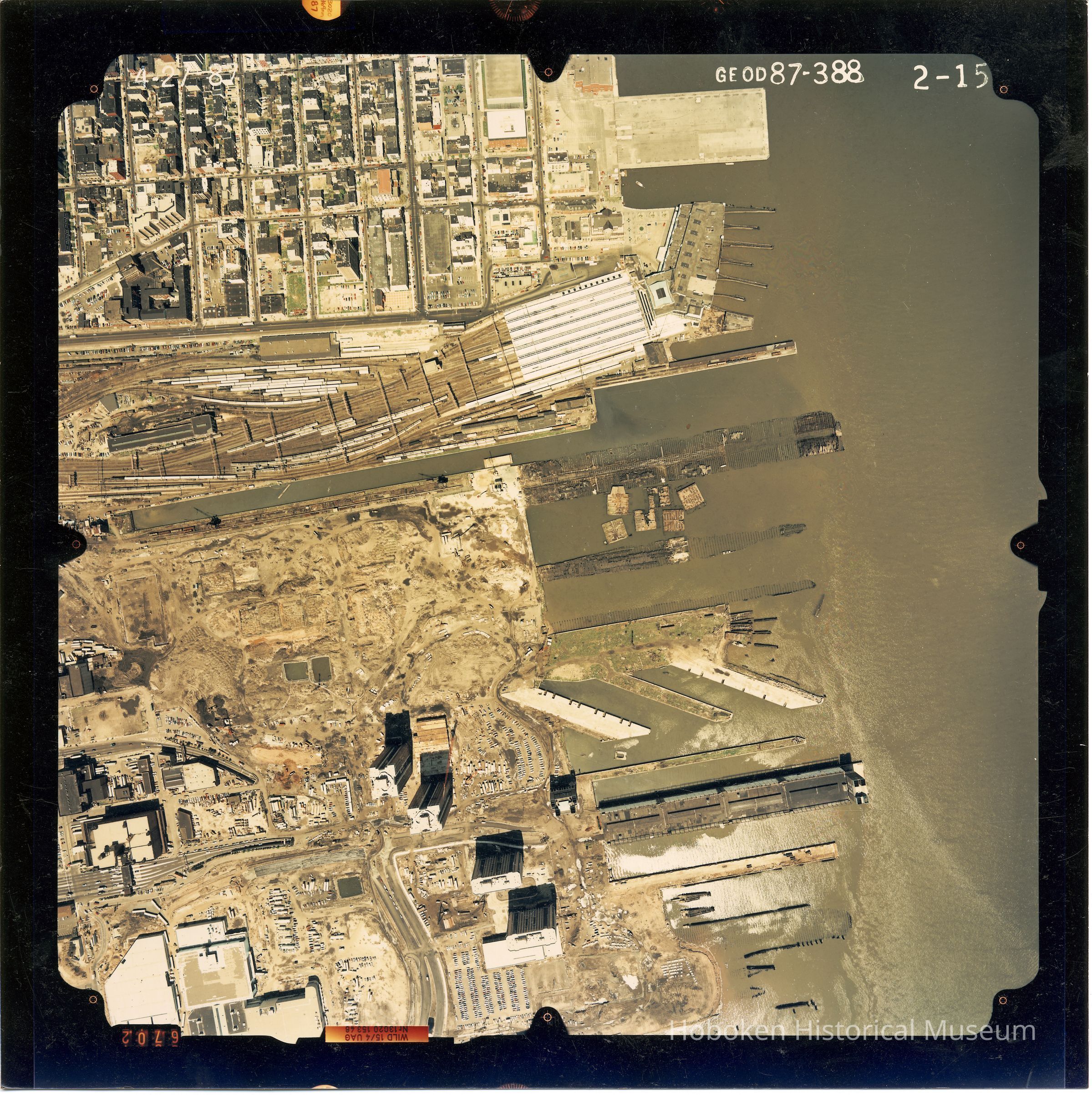 Color aerial photo of Hoboken from Grand Street to the waterfront; Newport, Jersey City to 2nd Street, April 27,1987.