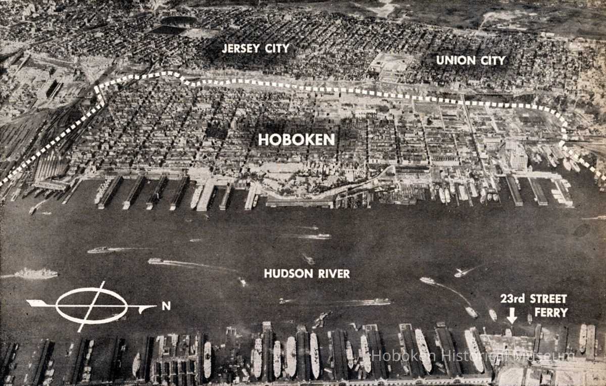 Printed black-and-white aerial photo of Hoboken as published on page 12 in newspaper PM, vol 1, no. 40, New York, August 12, 1940. Reference print on file. It was to illustrate article "Hoboken: Portrait of a Sick City." The newspaper article is archives catalogue 2005.003.0013. See related.